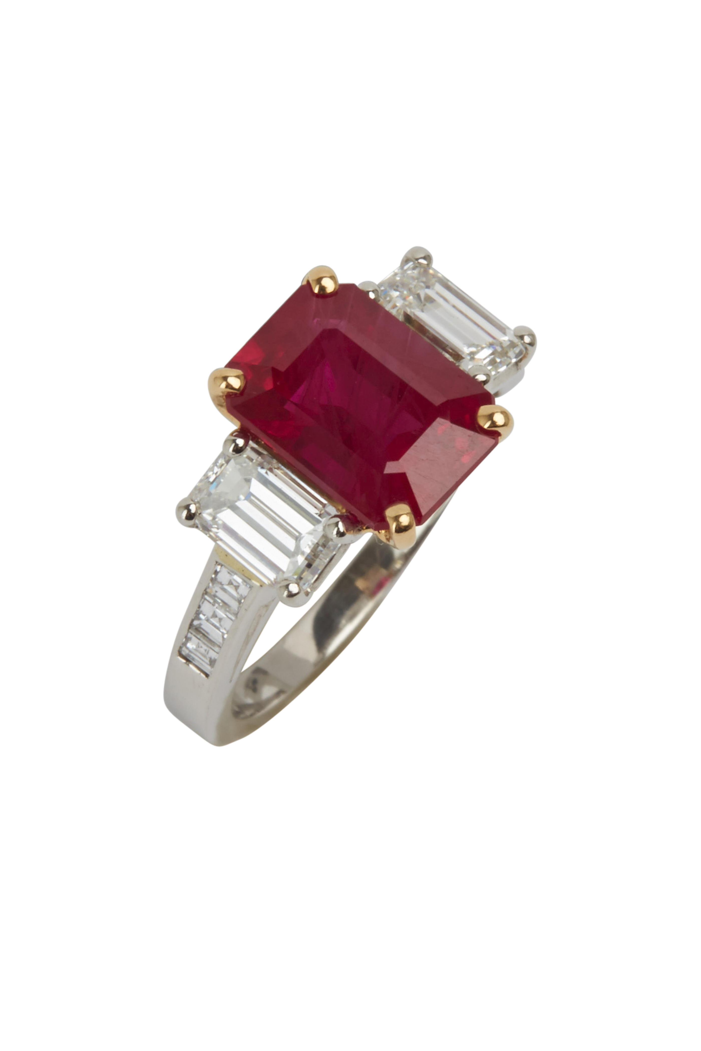 Platinum & yellow gold. 3.49cts emerald-cut red ruby gemstones. 1.41cts emerald-cut white diamonds. 0.24cts square-cut white diamonds. Cocktail ring.