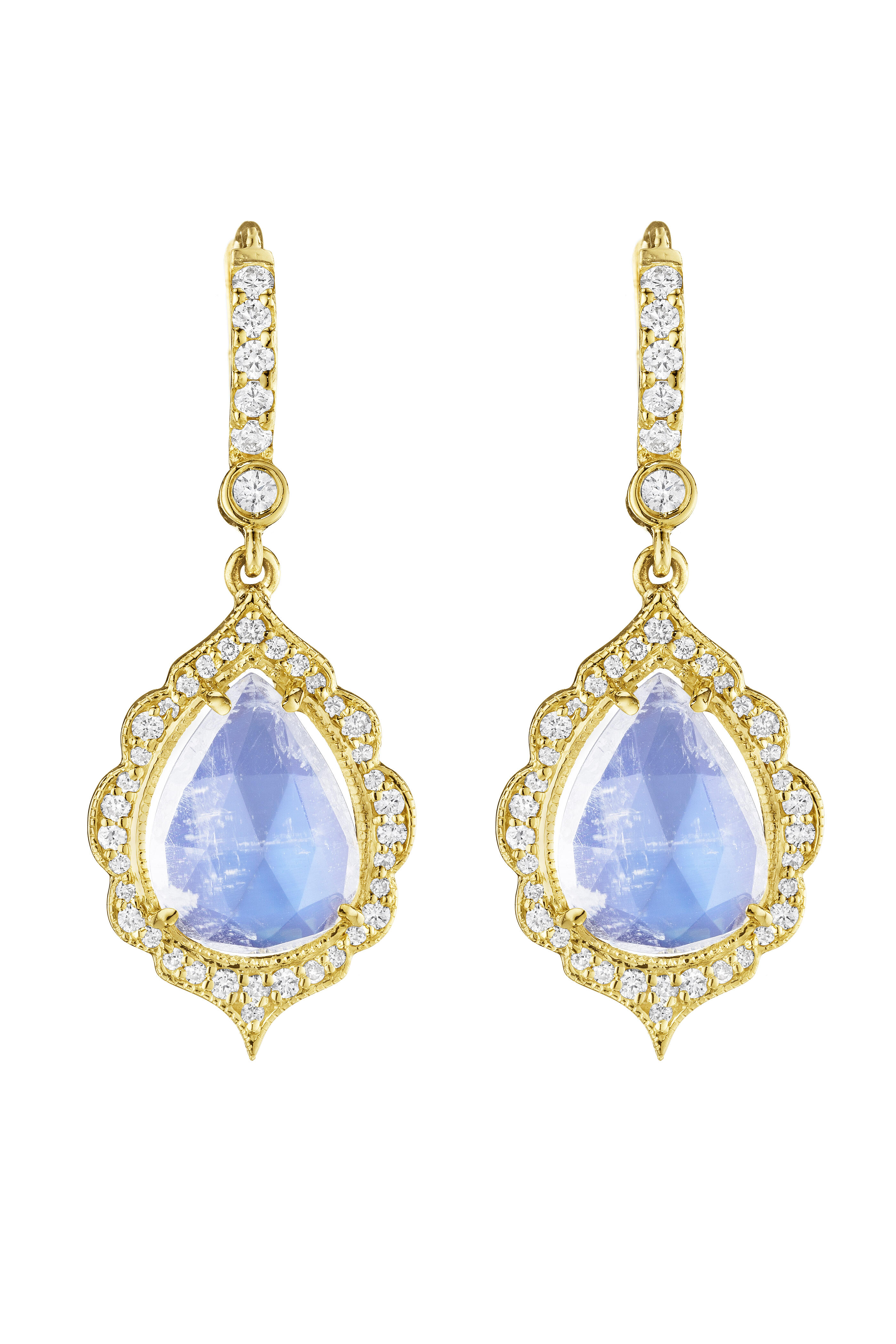 Yellow 18k gold drop earrings from Penny Preville featuring faceted, pear-shaped moonstones, a pave diamond frame with prong top. The shades of light blue accentuation can really create a powerful complement to many ensembles (0.66ct diamonds)