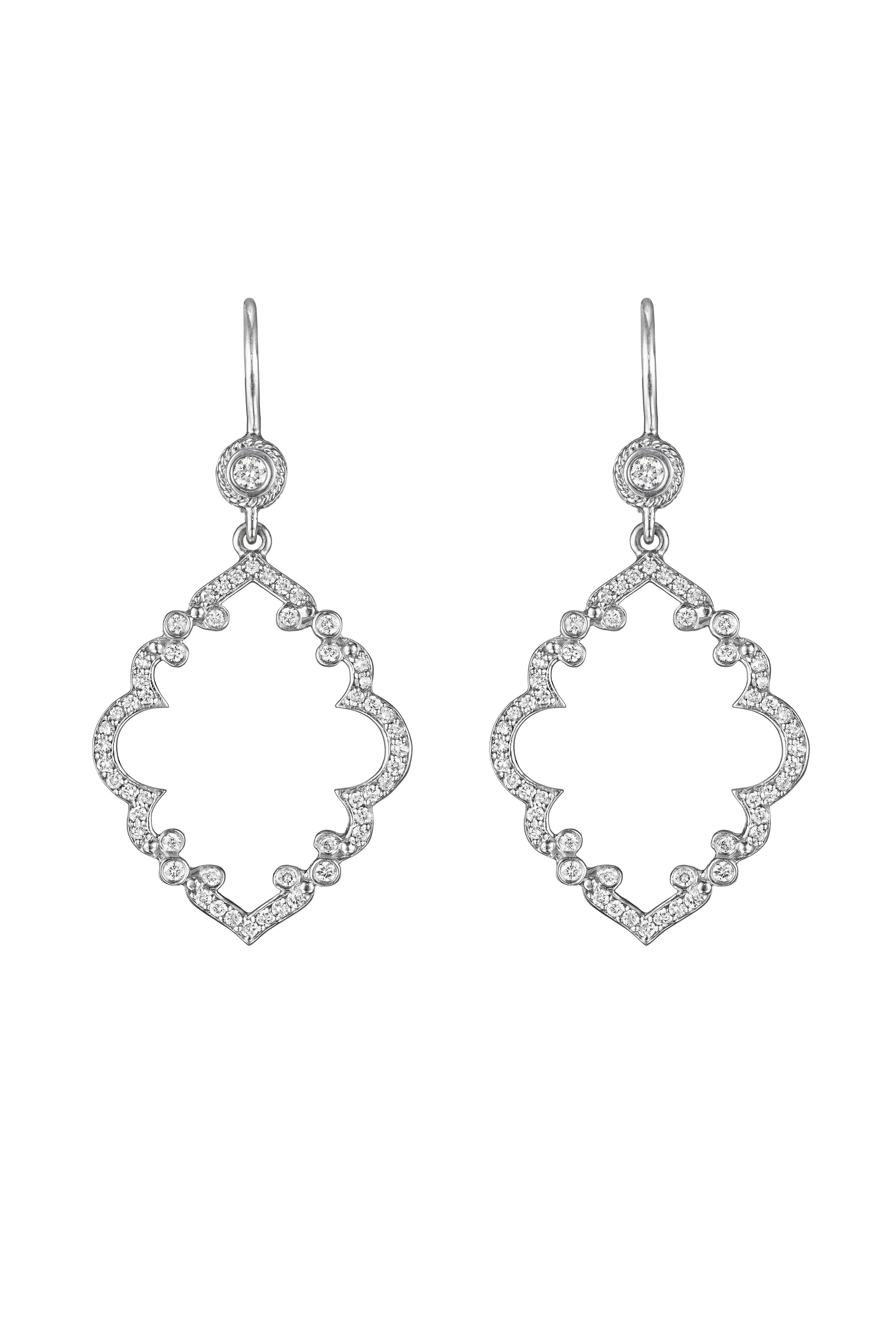 Crafted in 18k white gold featuring Arabesque medium diamond earrings with top bezel on french wire are a stunning addition to any outfit. (.76ct diamonds)