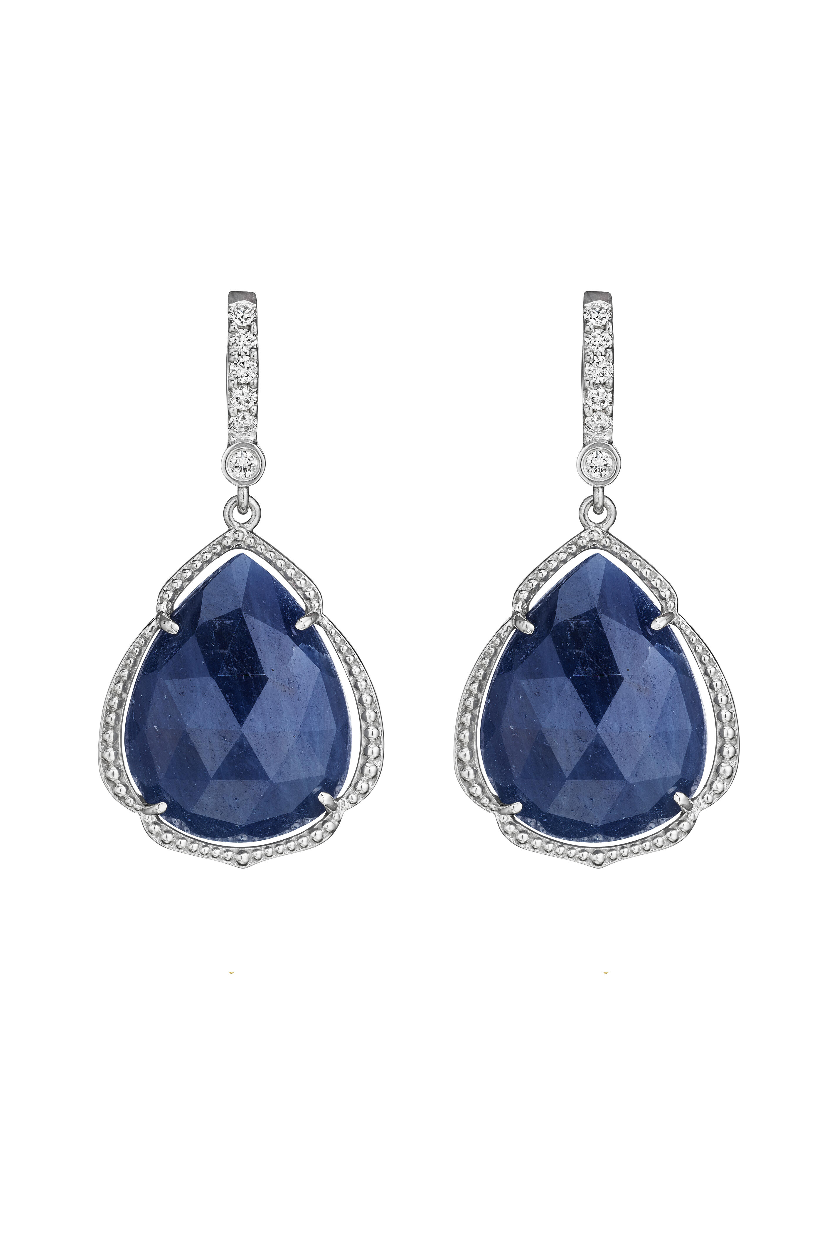 Crafted of white gold, these prong top earrings feature rich dark blue sapphires encased in the center. 18k white gold with prong top. They really complement and draw out any blue in the rest of your outfit.