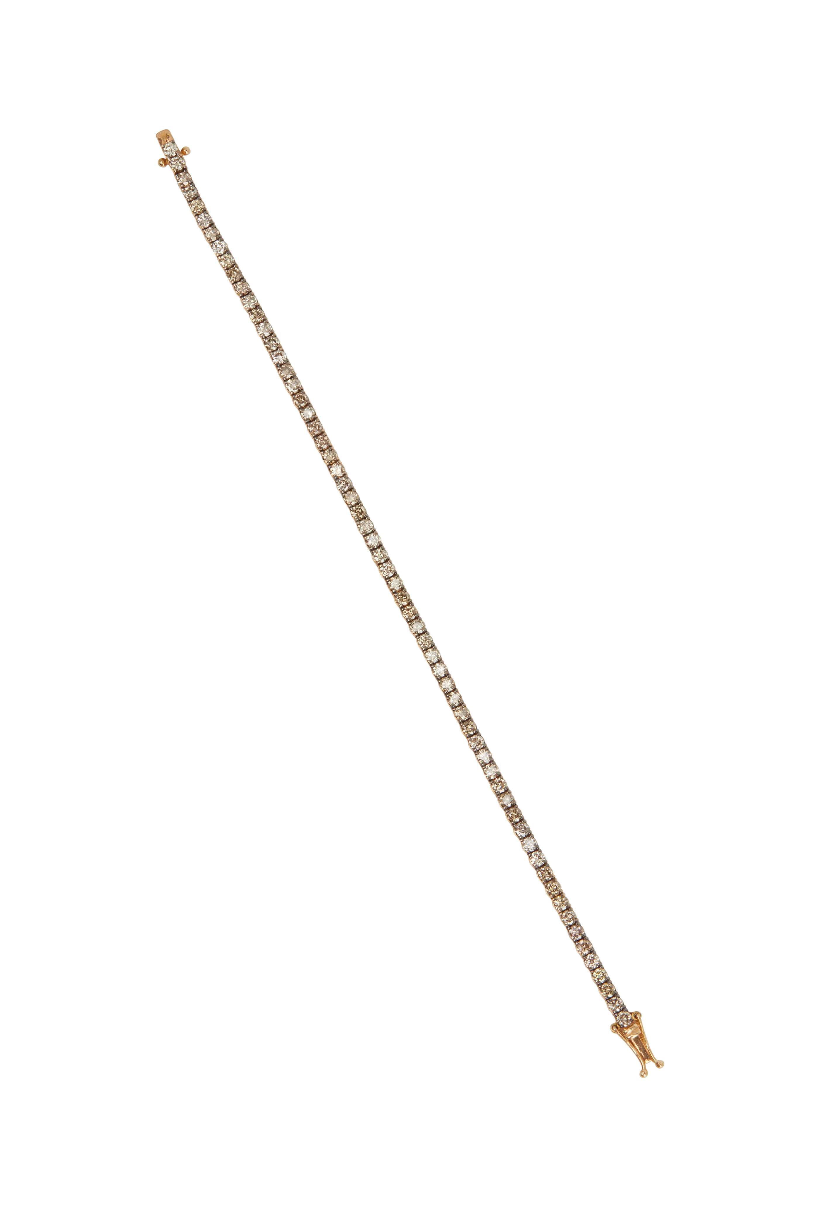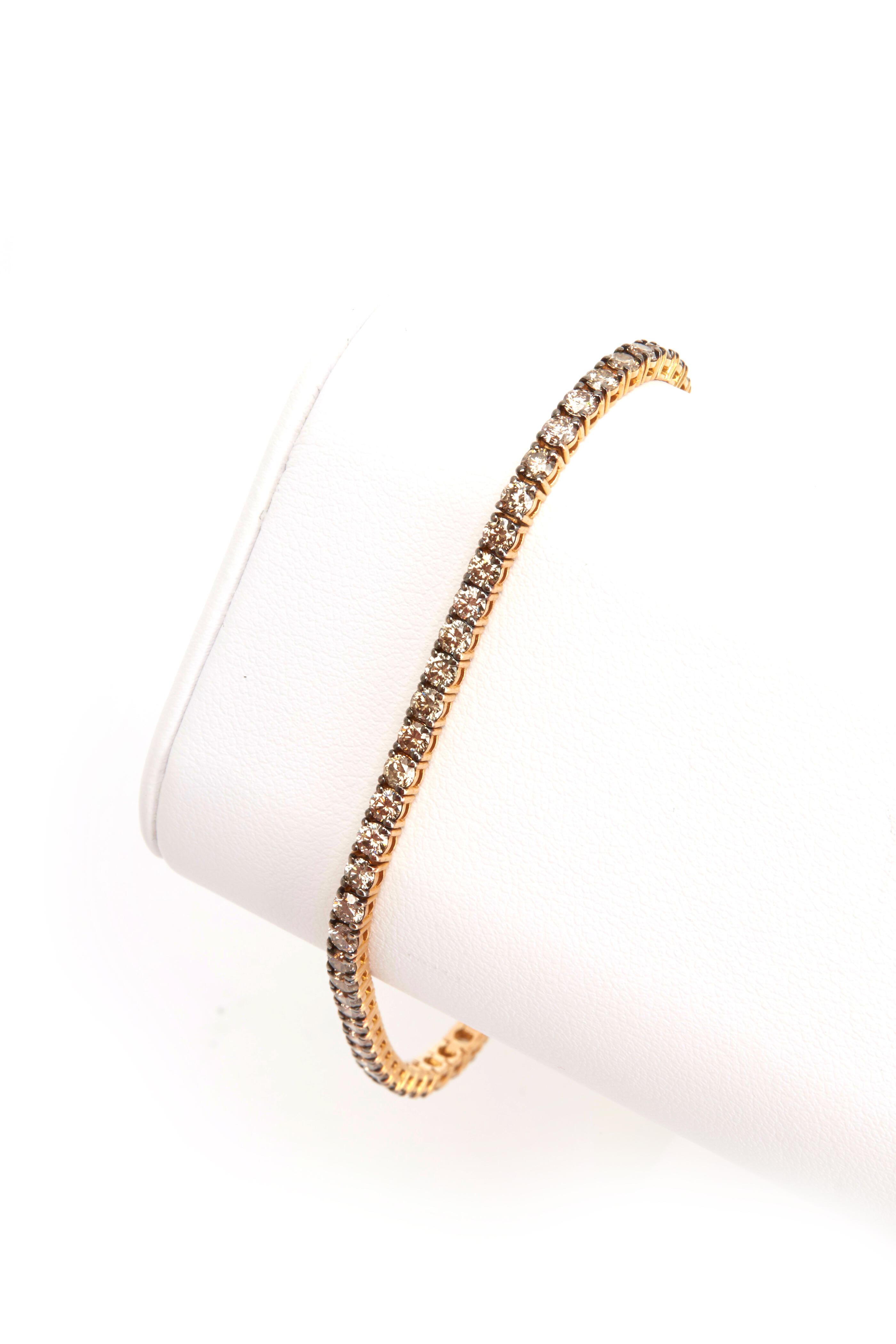 Endlessly enchanting, this magnificent diamond bracelet adds neat, watery sparkle to a slim bracelet that is full of charm. The warm, yellow gold frame blends seamlessly with an assortment of sparkling champagne diamonds.