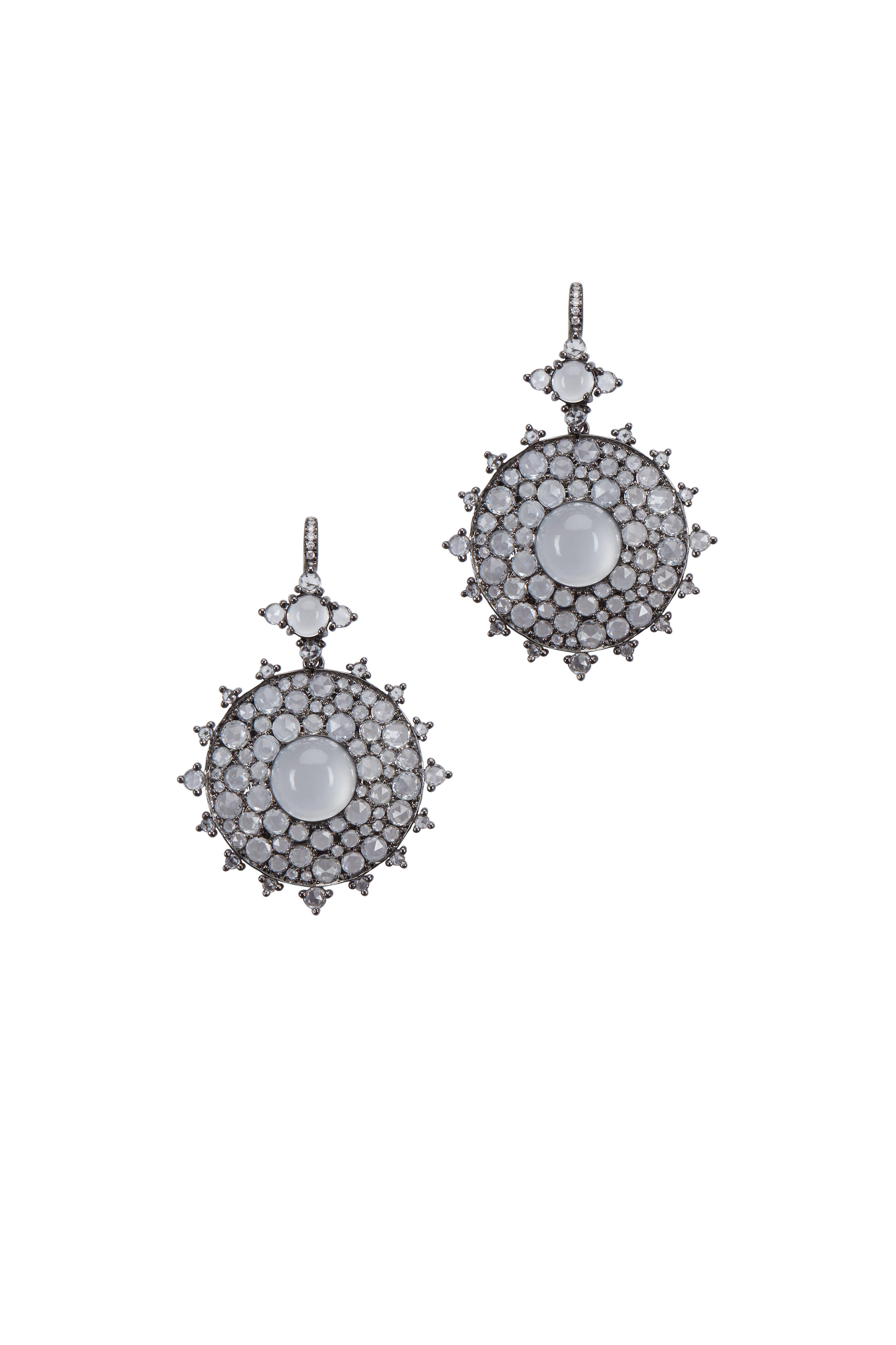 18k white gold. 11.5cts rose-cut white sapphire gemstones. 8cts moonstones. Bullseye design.