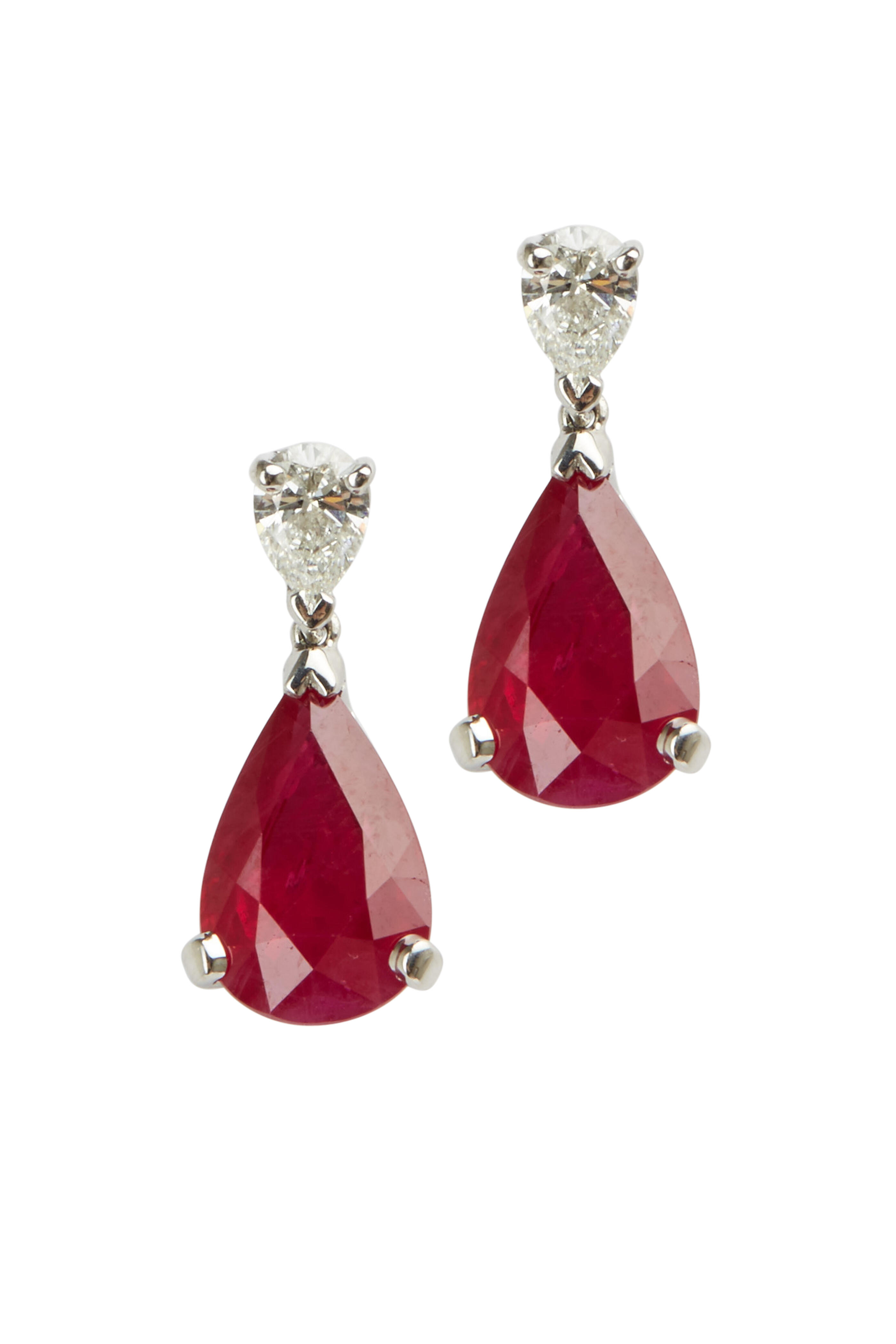 Platinum. 6.04cts (2) pear shape red ruby gemstones. 0.51cts (2) pear shape white diamonds. Dangle earrings.