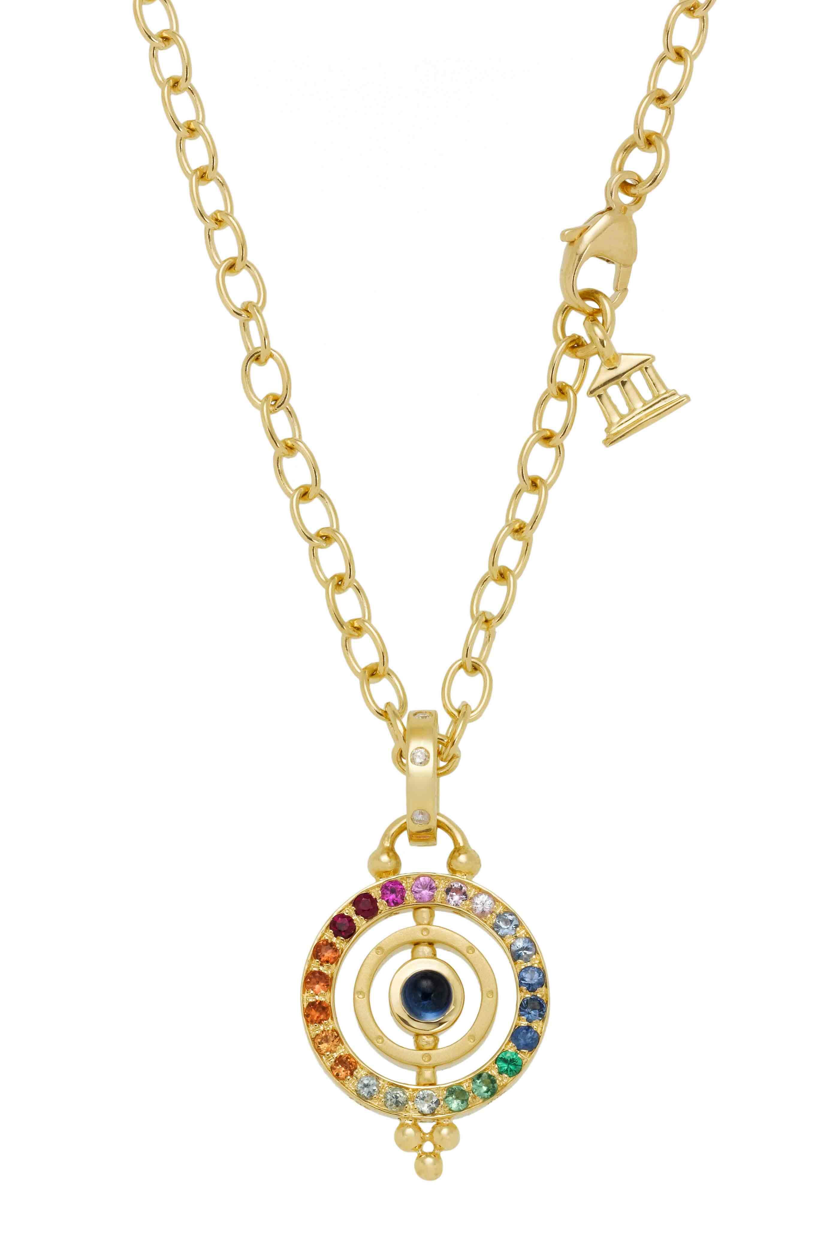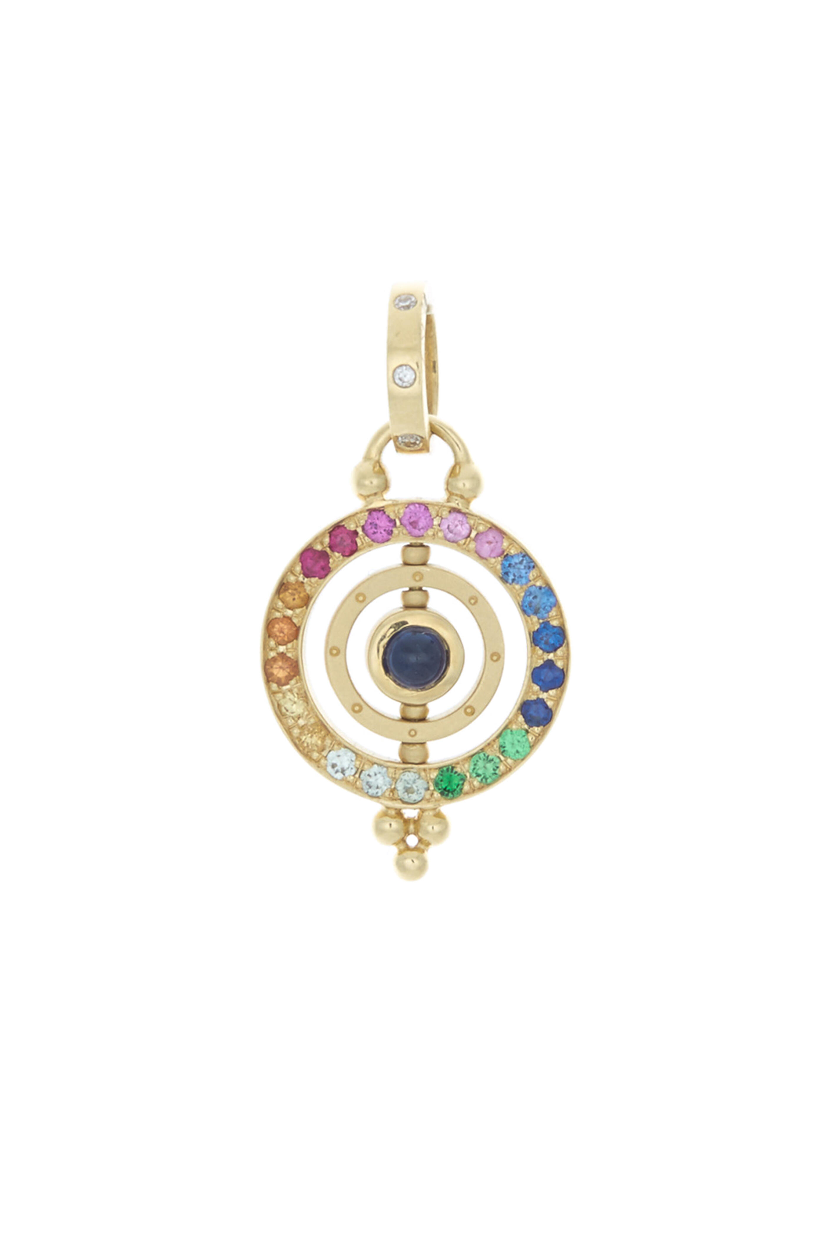 From the Celestial Collection. 18K yellow gold. 0.21cts blue sapphires. 0.10cts pink sapphires. 0.04cts rubies. 0.06cts medium orange sapphires. 0.04cts light orange sapphires. 0.06cts light green sapphires. 0.06cts tsavorite. 0.06cts light blue sapphire. 0.045cts diamonds. Spinning center disc & gold ring. *Chain not included.