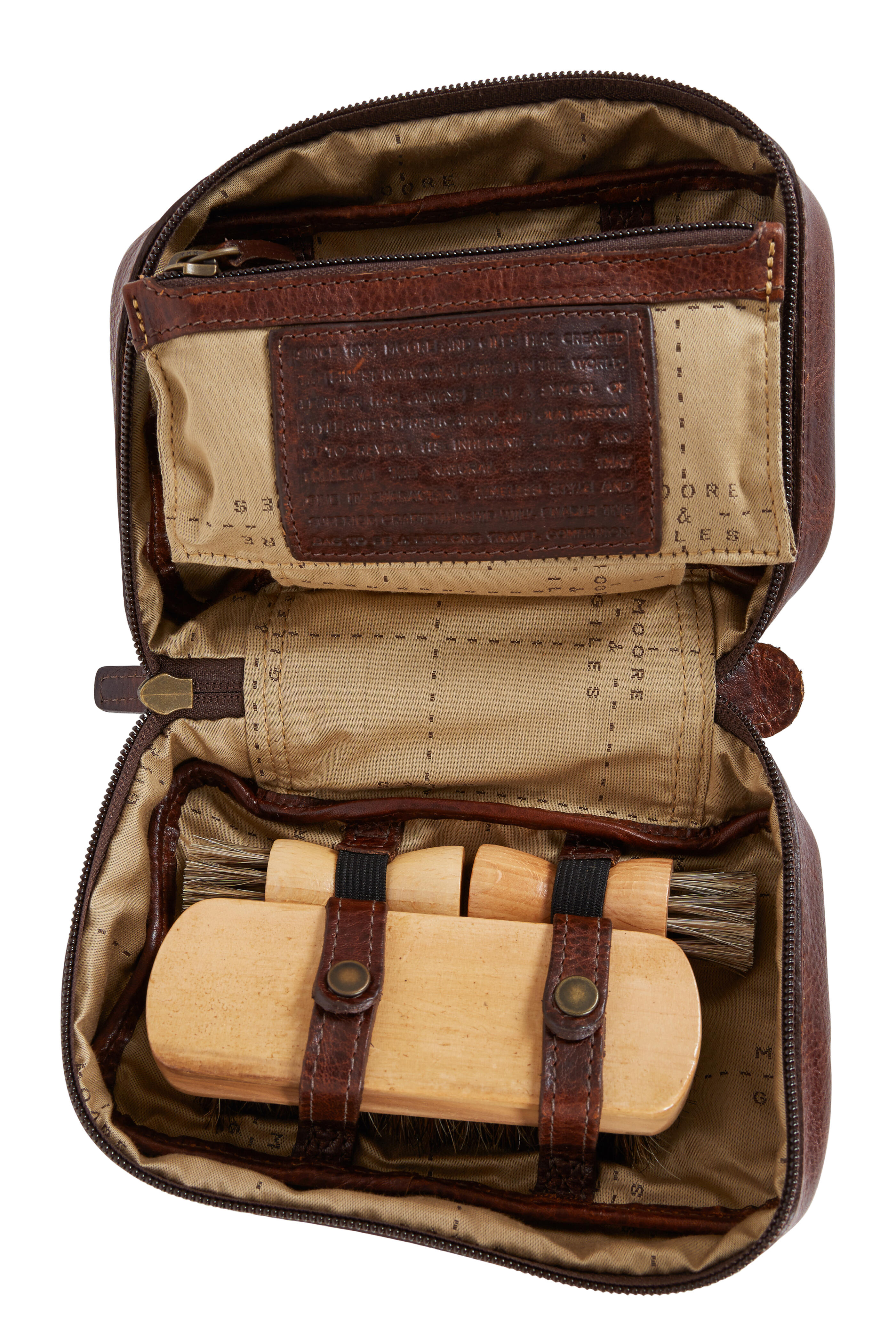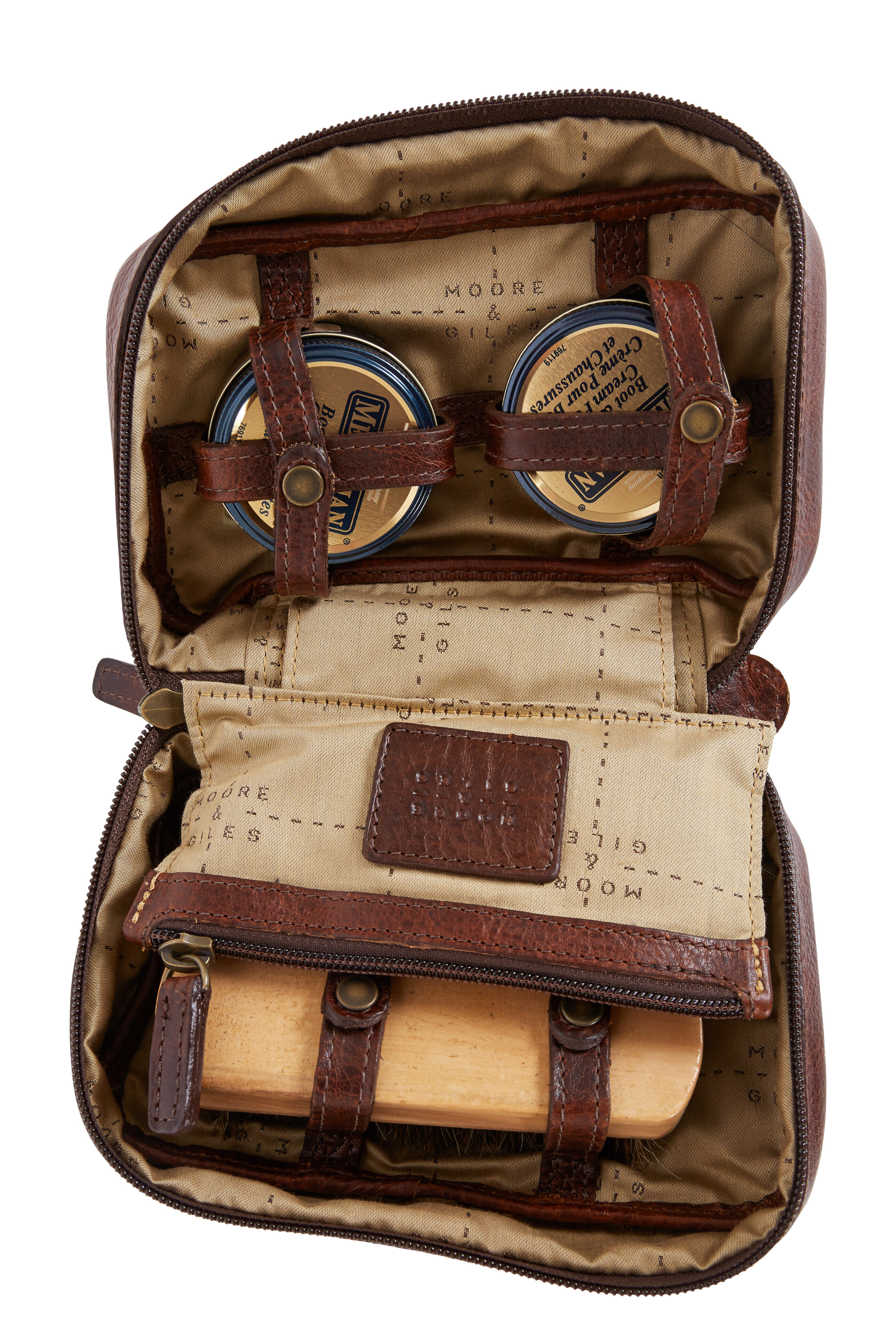 Titan milled leather case. Wrap around zipper closure. Includes: One black and one brown jar of shoe polish, two small Moore & Giles applicator brushes, one large buffing brush and one premium polishing cloth. Made in the USA. Width: 7". Height: 5 ½". Depth: 2".