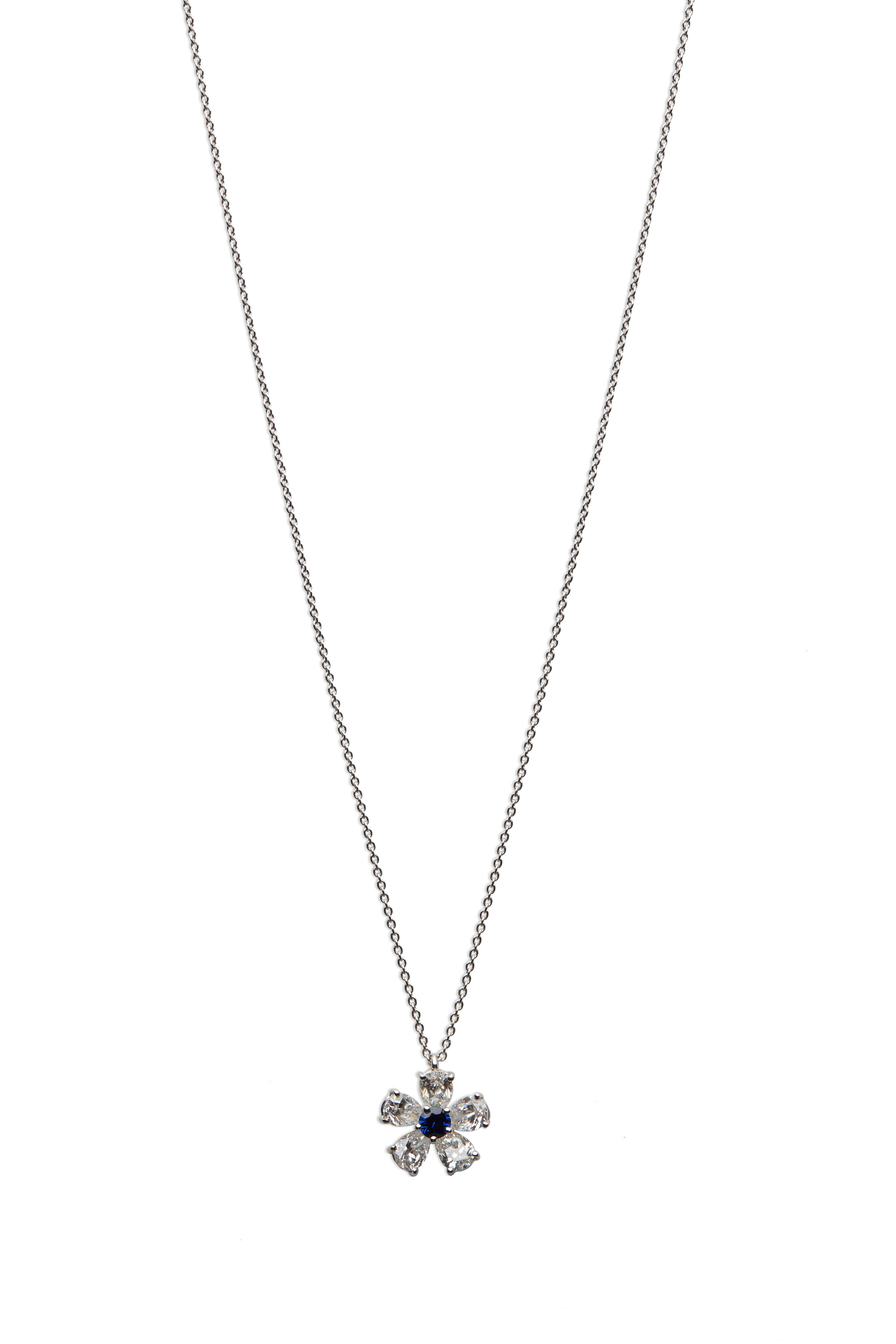 Platinum. Round sapphire center gemstone. Pear shape white diamond petals. Flower pendant.