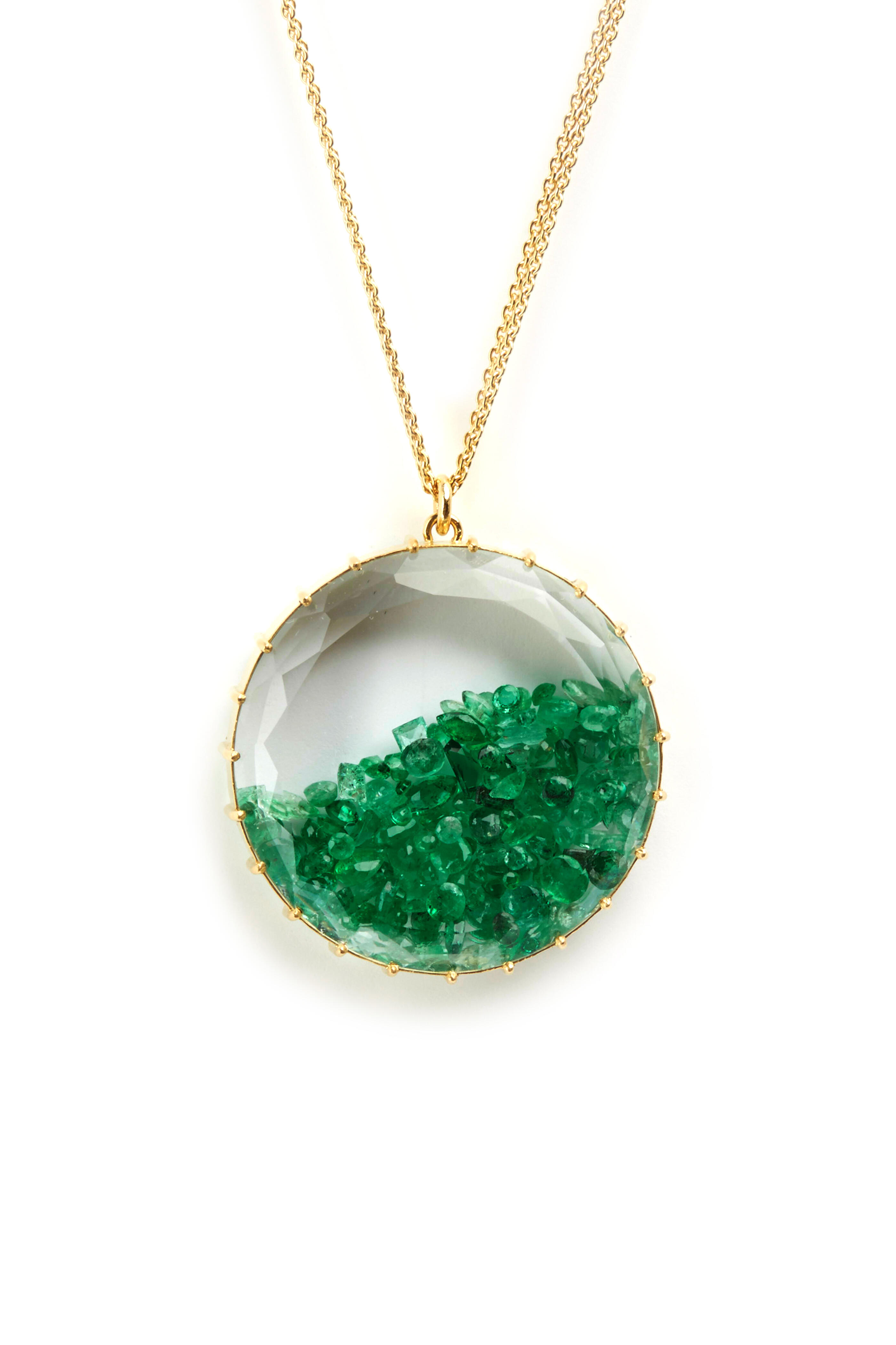 18k yellow gold. Green emerald gemstone shake. Double cable chain.