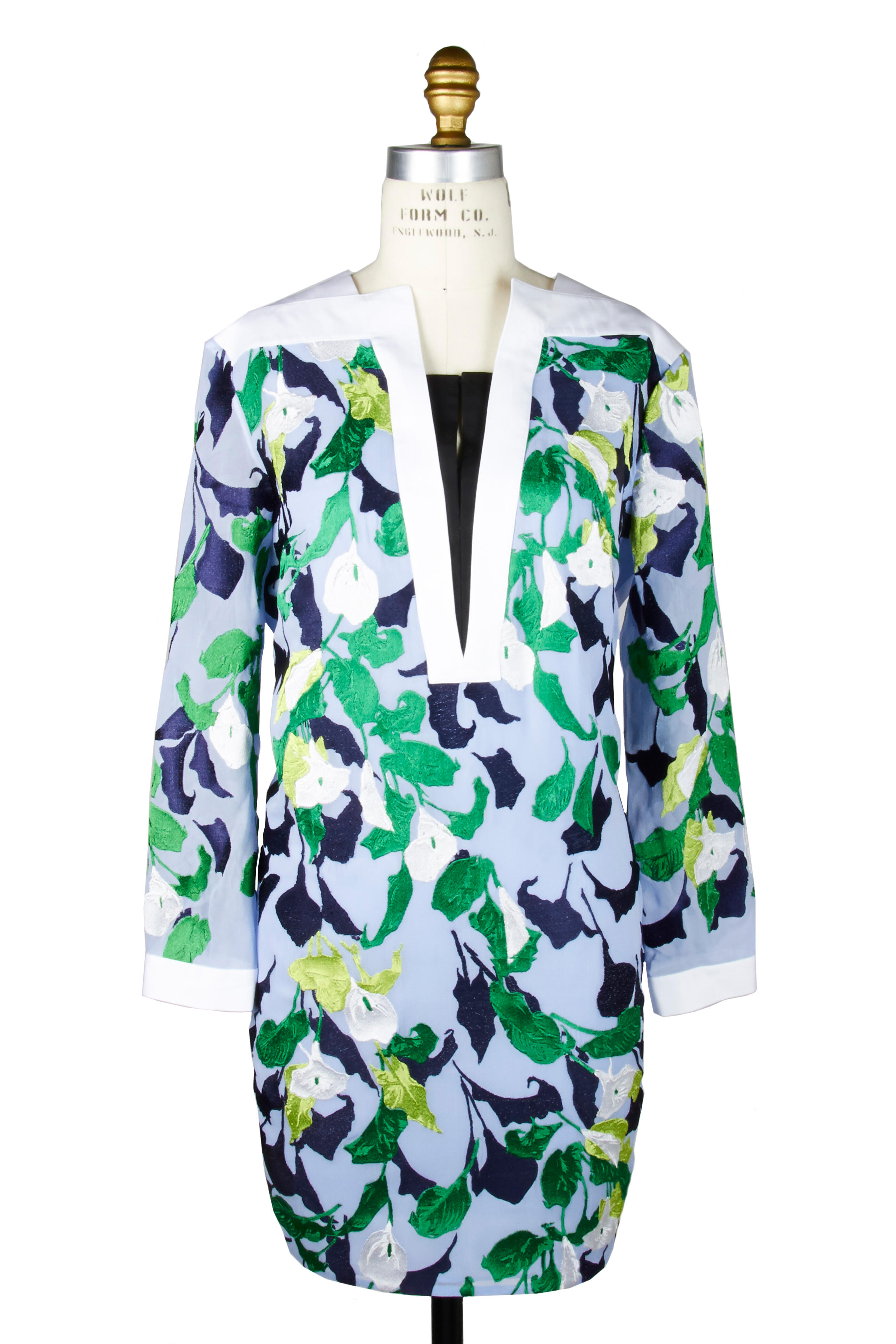 This solid white shift dress features a floral pattern of blue, green, white, yellow, and navy blue. The dress has a square neckline, long sleeves with solid white button cuffs, a front keyhole with a two button fastening and a back hidden zipped closure. The floral pattern is perfect to wear in the spring.
