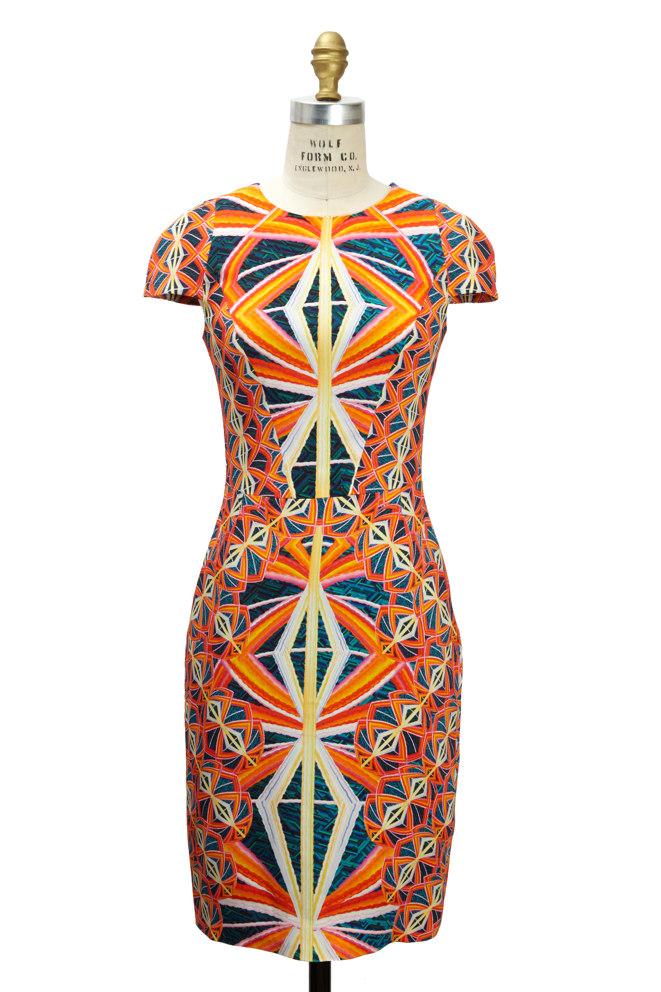 Add a pop of color to your wardrobe with this edgy and unique orange, multicolored, and multi patterned cap sleeve dress.