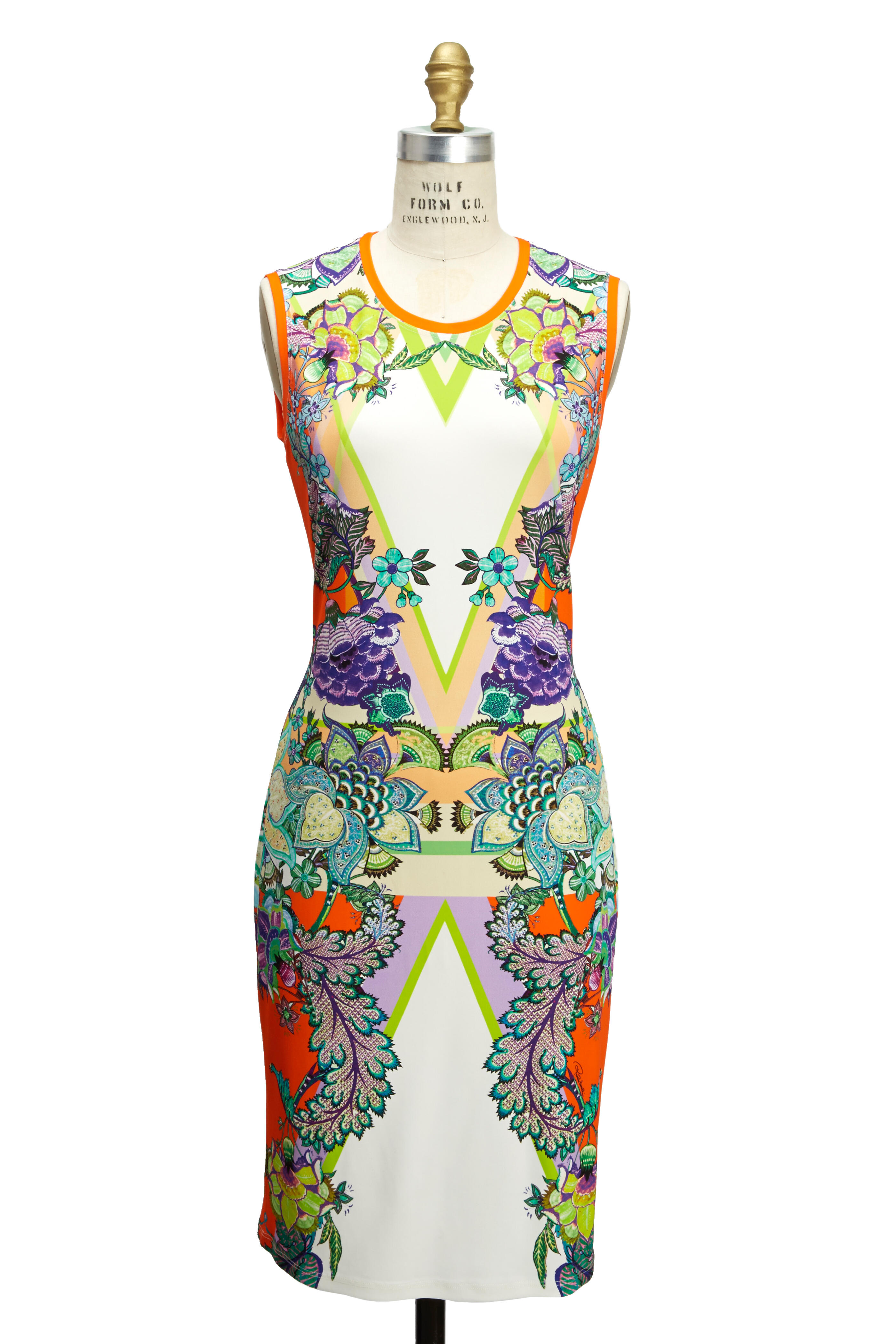 This dress in a beautiful multicolored floral print frames this sleeveless dress with a high neckline. It's the ideal dress to stand out with eye catching appeal.