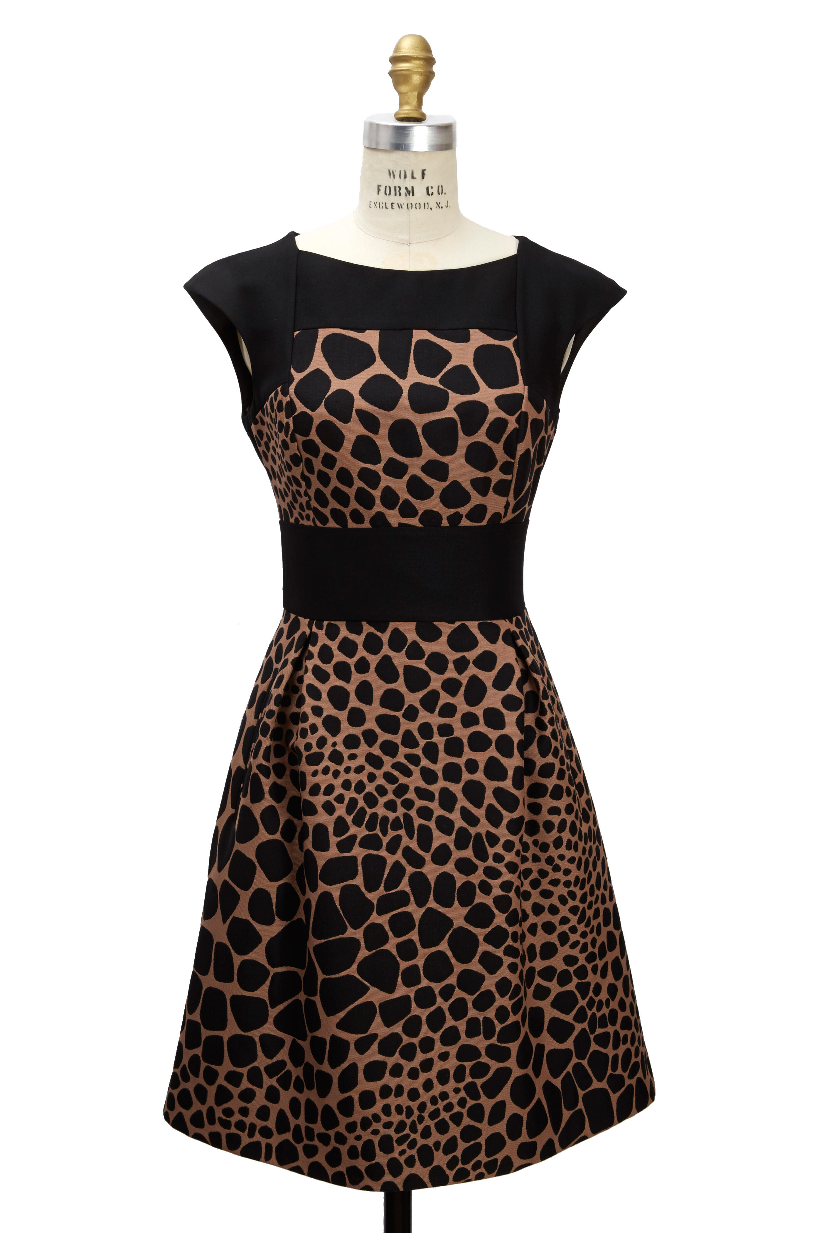 This cap sleeve dress has a stunning giraffe jacquard print with a black cinched waist and will flatter you from every angle.