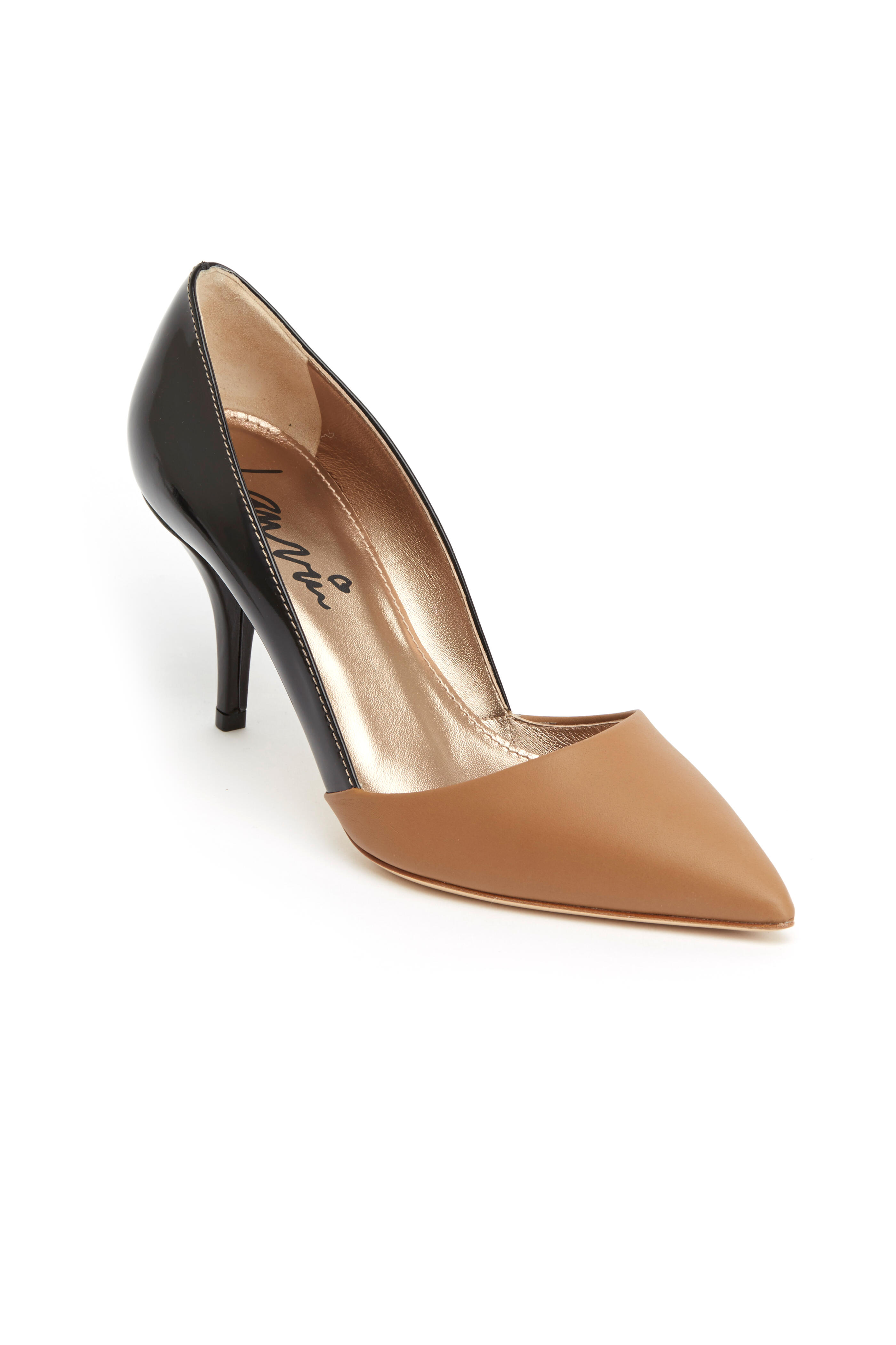 These pumps that are made out of two kinds of colored leather. The cap toe is a beige colored leather while the back of the pumps is a black leather for a dynamic color scheme.