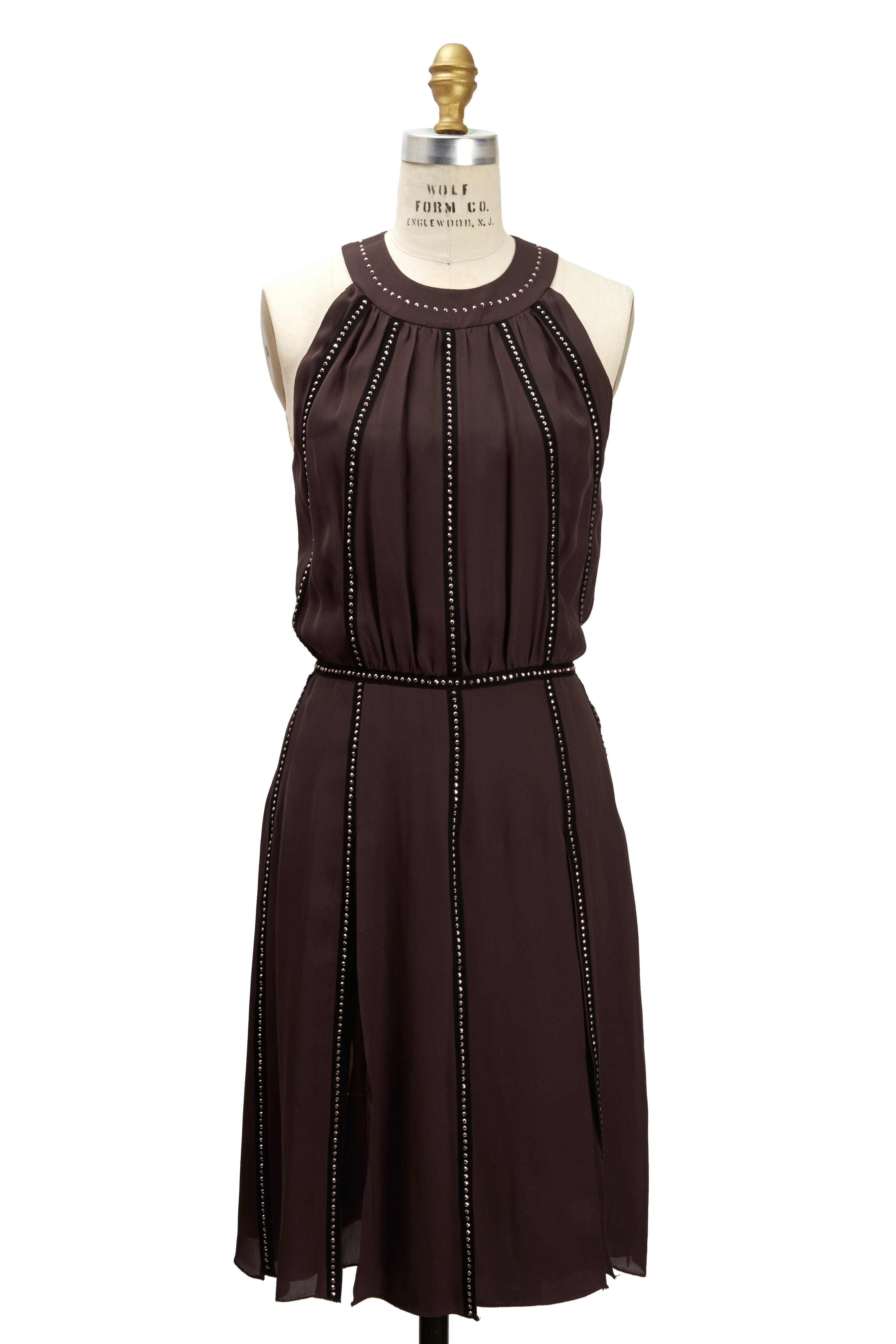 In down-to-earth colors, a lattice of faceted studs encase L'Agence's ladylike blouson bodice, cinching the waist and finishing the neckline.