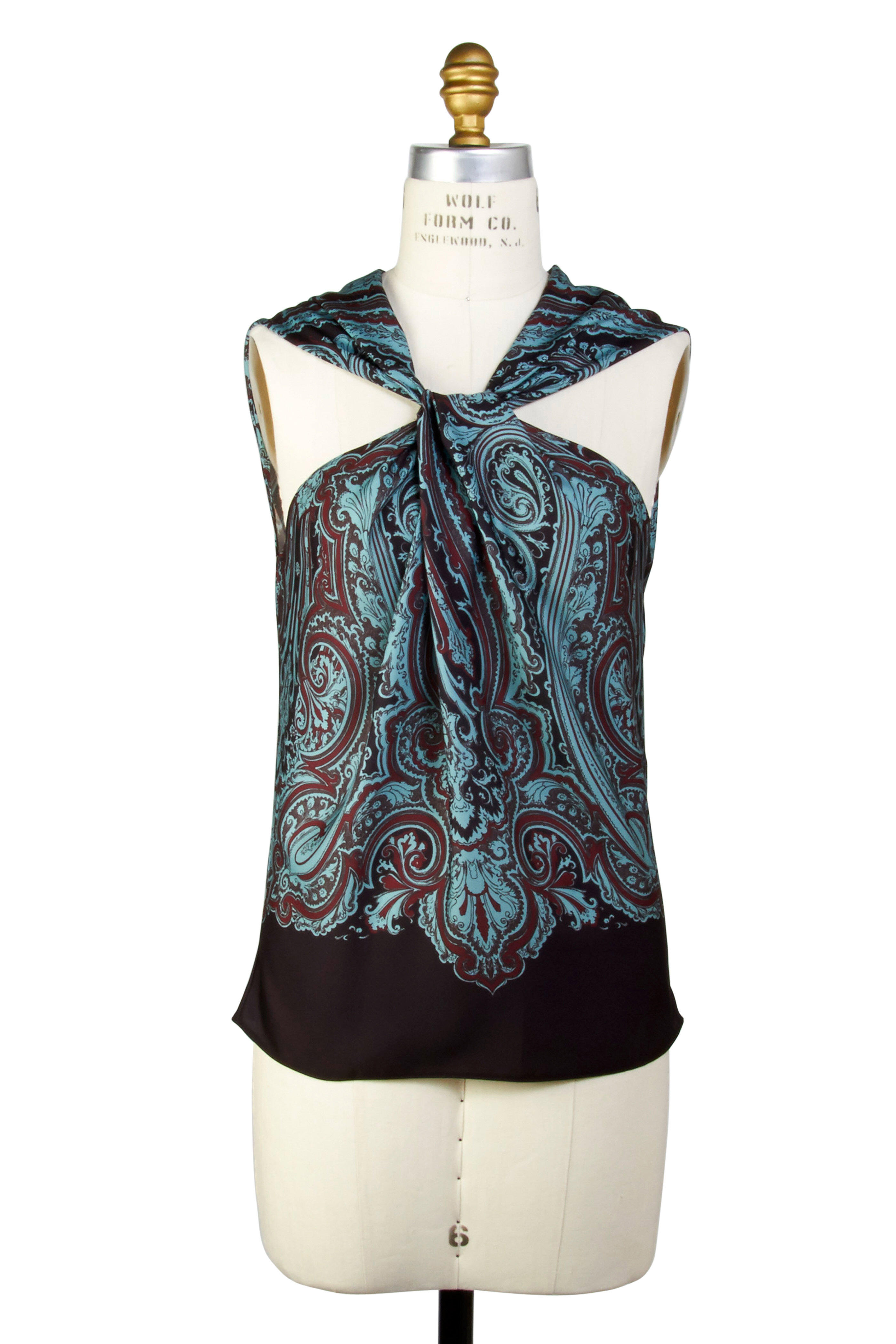 A mysterious red seeps into Lanvin's turquoise paisley while a eloquent halter neckline imbues youthful grace.