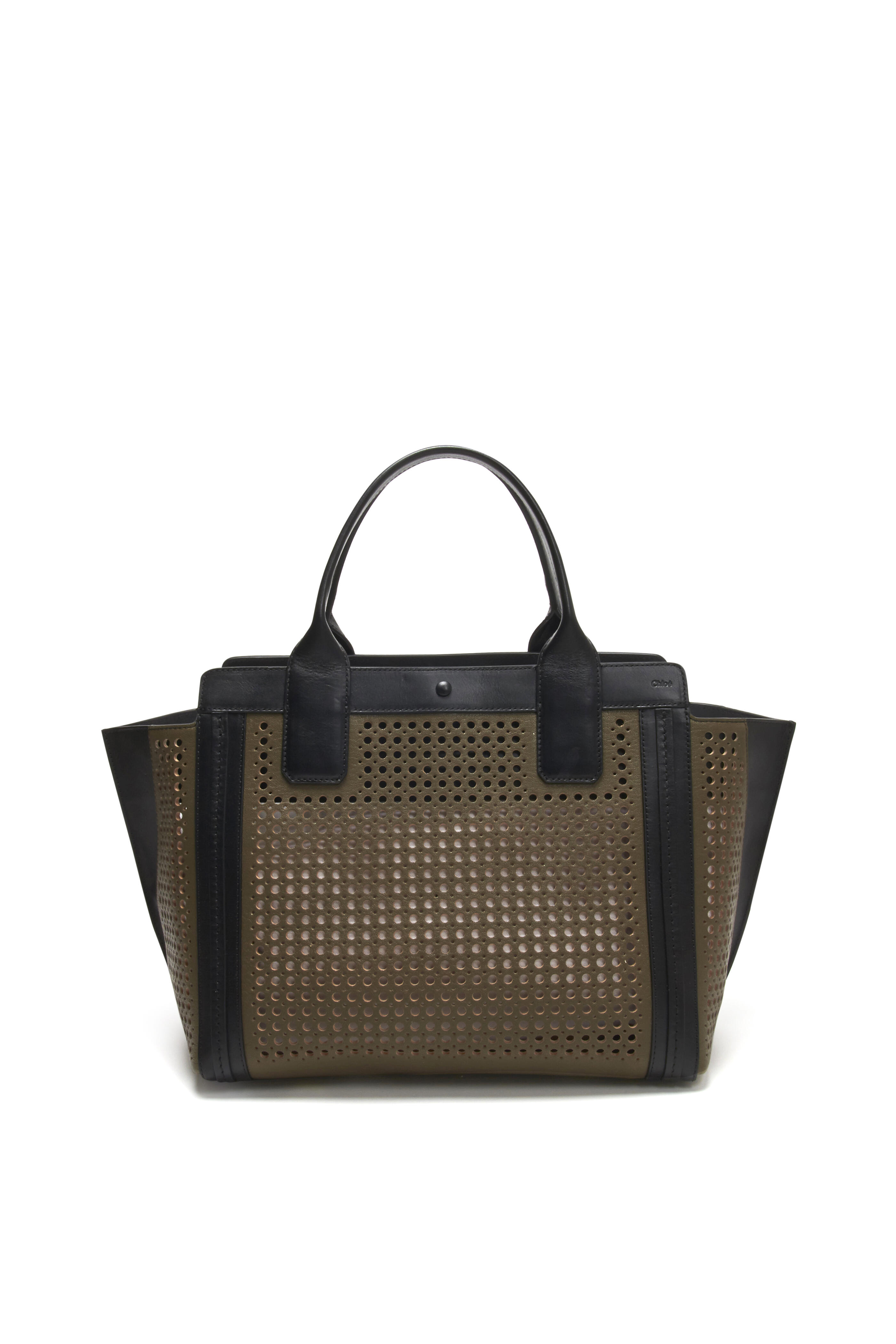 This bag is defined by its sharp contrasting yet modern look. The body of the bag is made in a perforated light green leather with a dark grey leather trim. The bag has two rolled handles, and accordion sides.