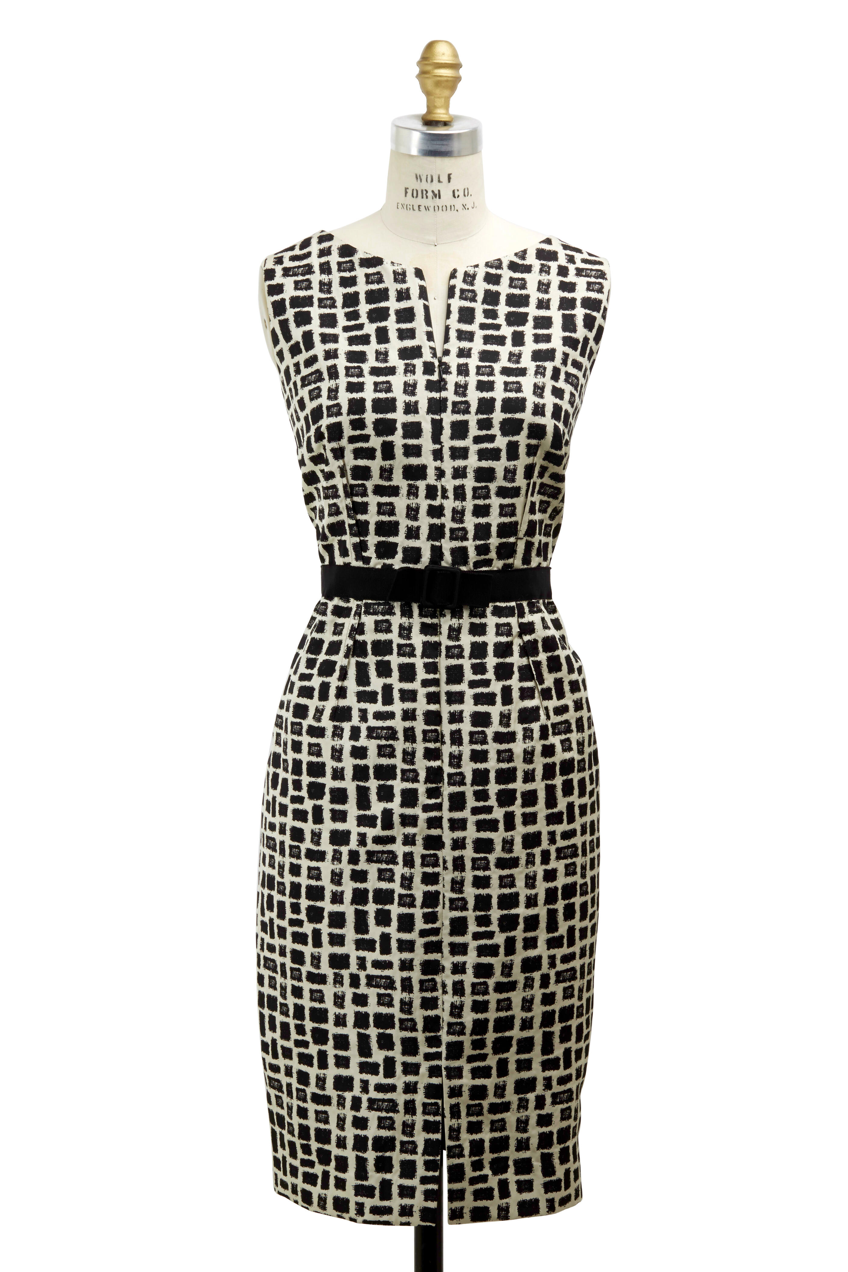Who says fashion isn't art? Look as visually stunning as a Picasso painting in this black and ecru jacquard dress. Tailored with darts at the bust, waist and back to create a svelte silhouette. Featuring a hidden front zip and grosgrain belt with snap-on bow. Made of polyester.