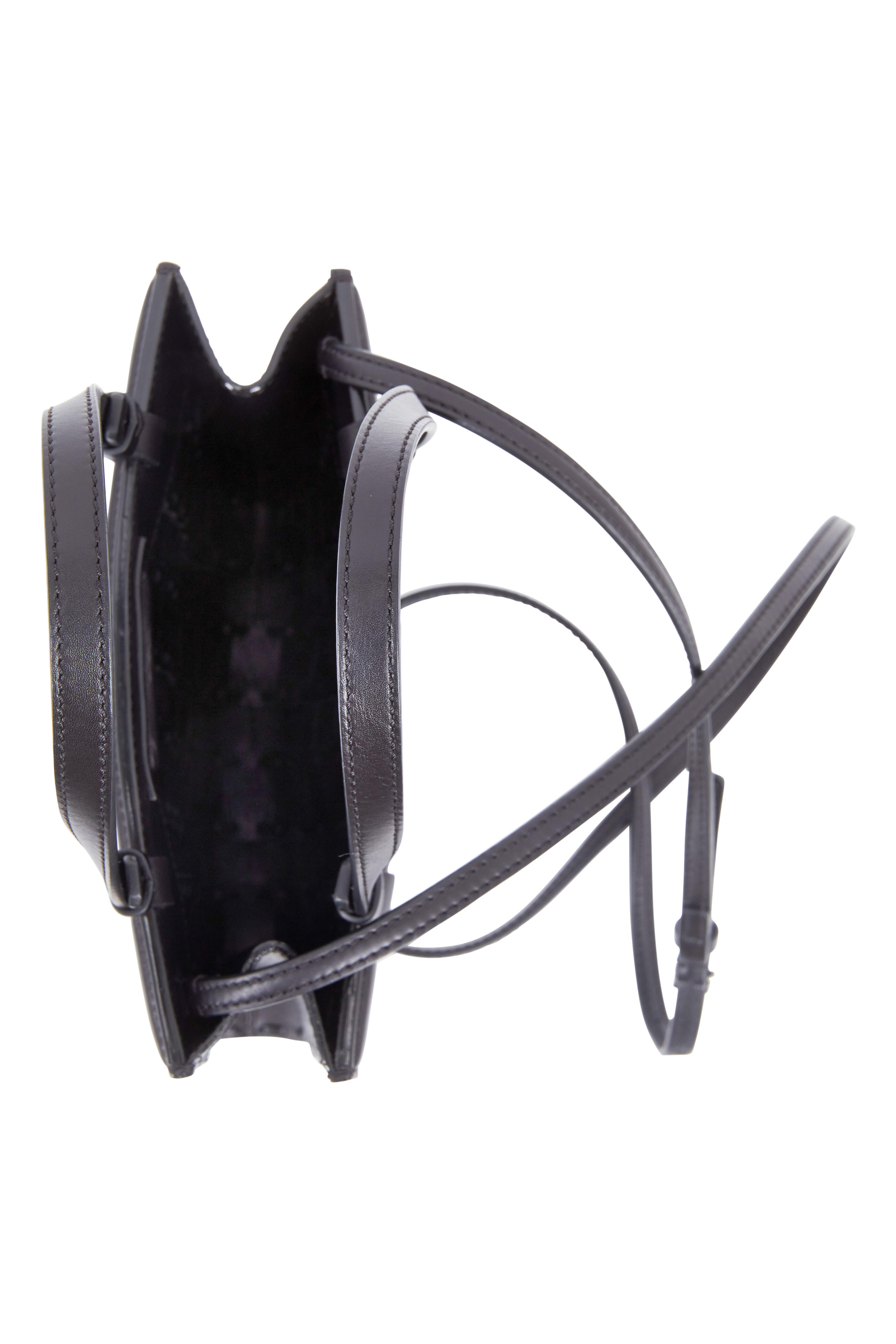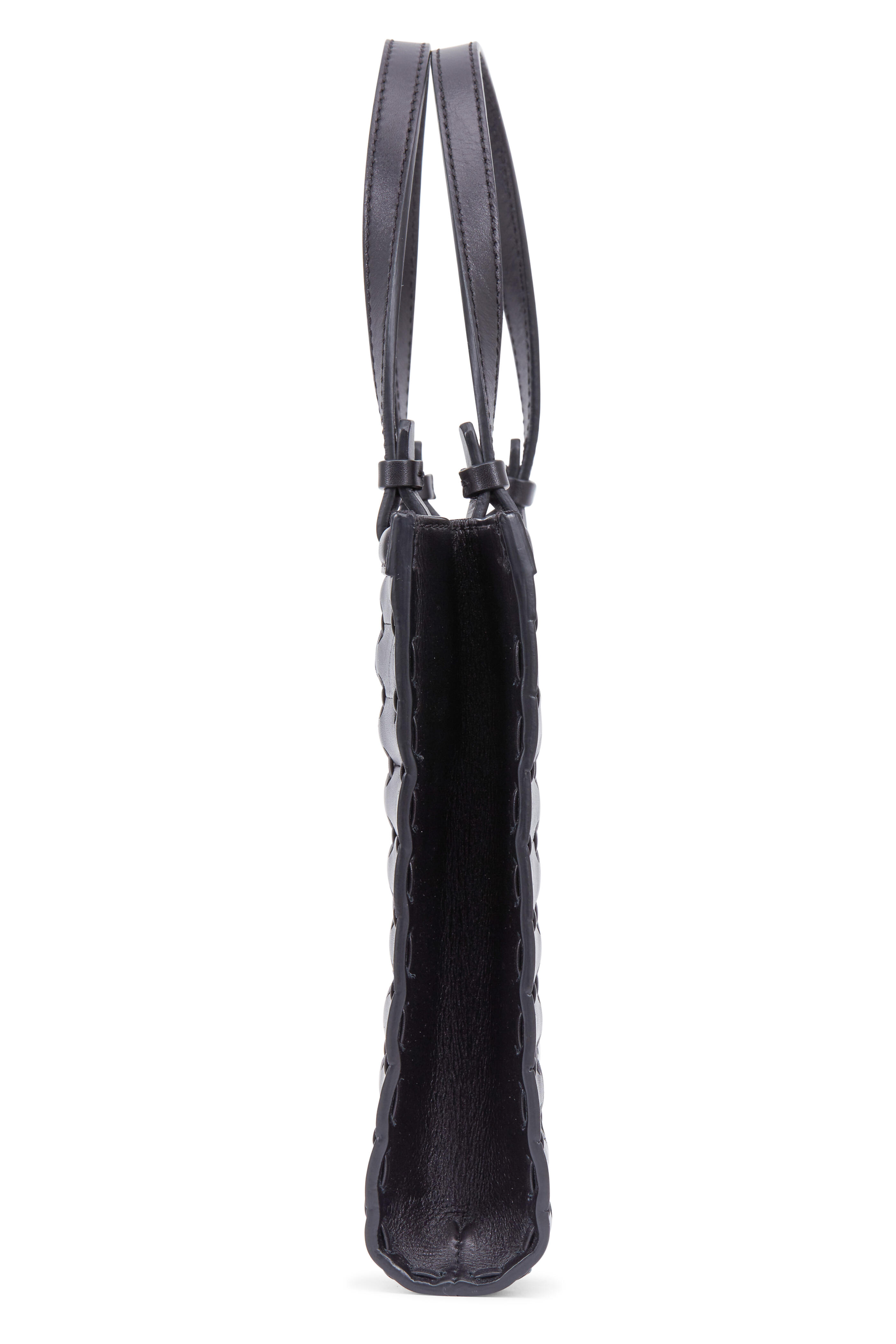 Calfskin woven leather. Dual flat top handles. Adjustable crossbody strap. Concealed magnetic top closure. Made in Italy. Width: 8". Height: 7 ½". Handle drop: 5". Crossbody strap drop: 23".