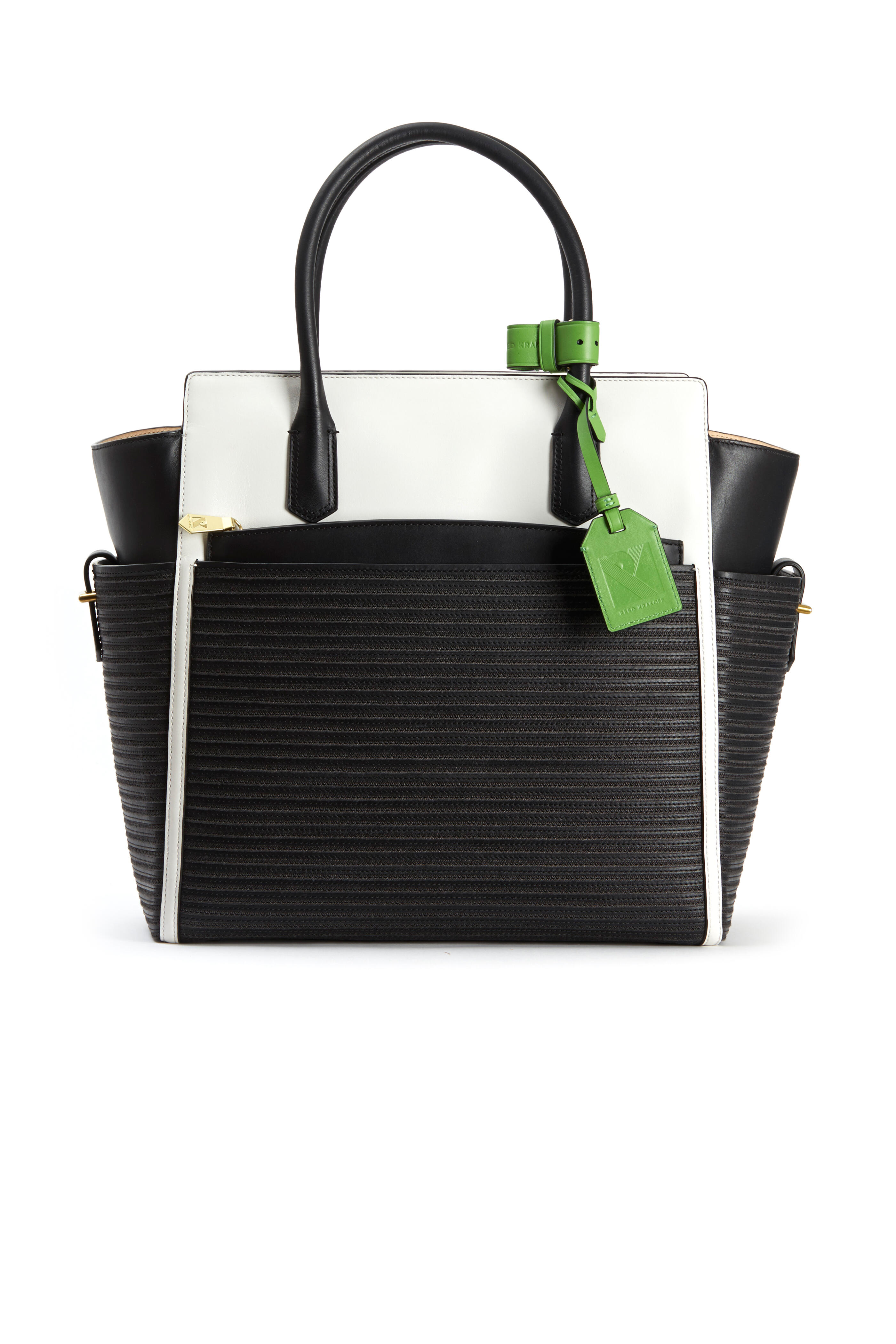 This handbag has a white leather inside with a black leather side pockets and a black embroidered straw front. The bag is accented with a green peridot luggage tag. There is a zip top closure and a top handle. This bag has so much character and personality, you'll get everybody's attention.