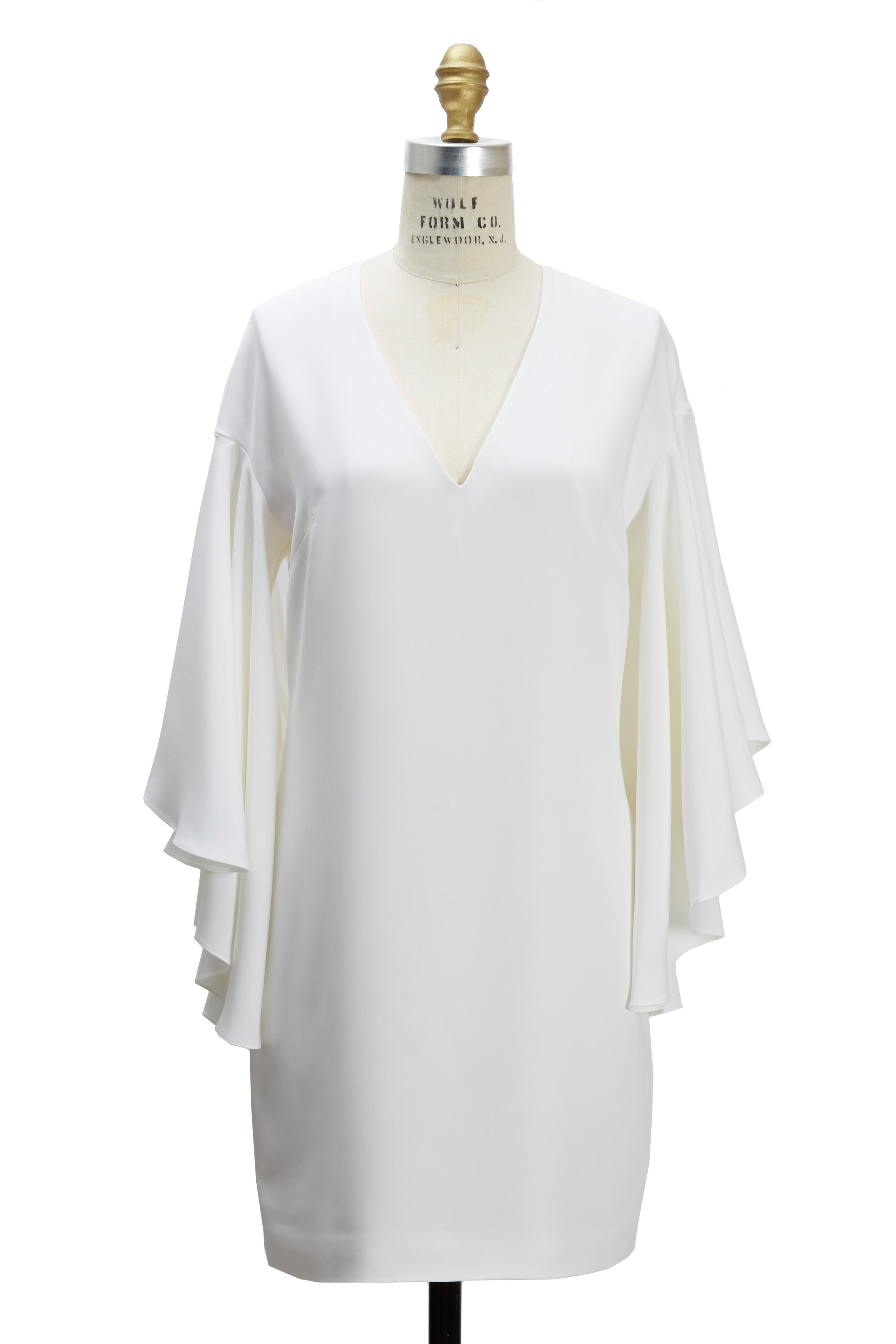 Beautiful and soft white silk features a silhouette with a deep v neck line and flowy ¾ sleeves.