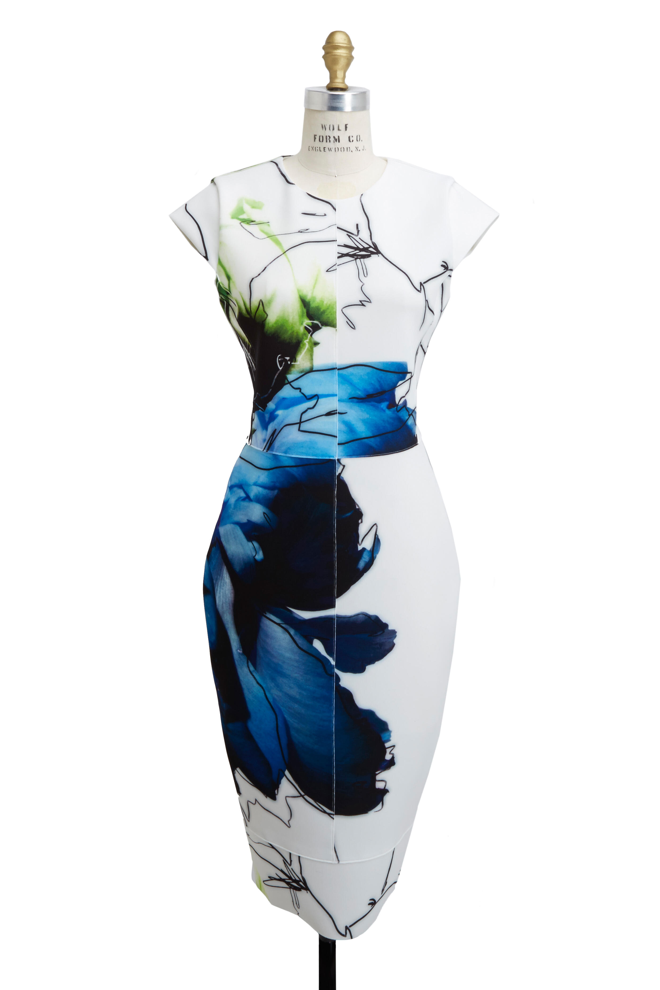 This vibrant and unforgettable dress offers a precisely tailored shape with a gorgeous floral motif design. It has a round neckline and cap sleeves.