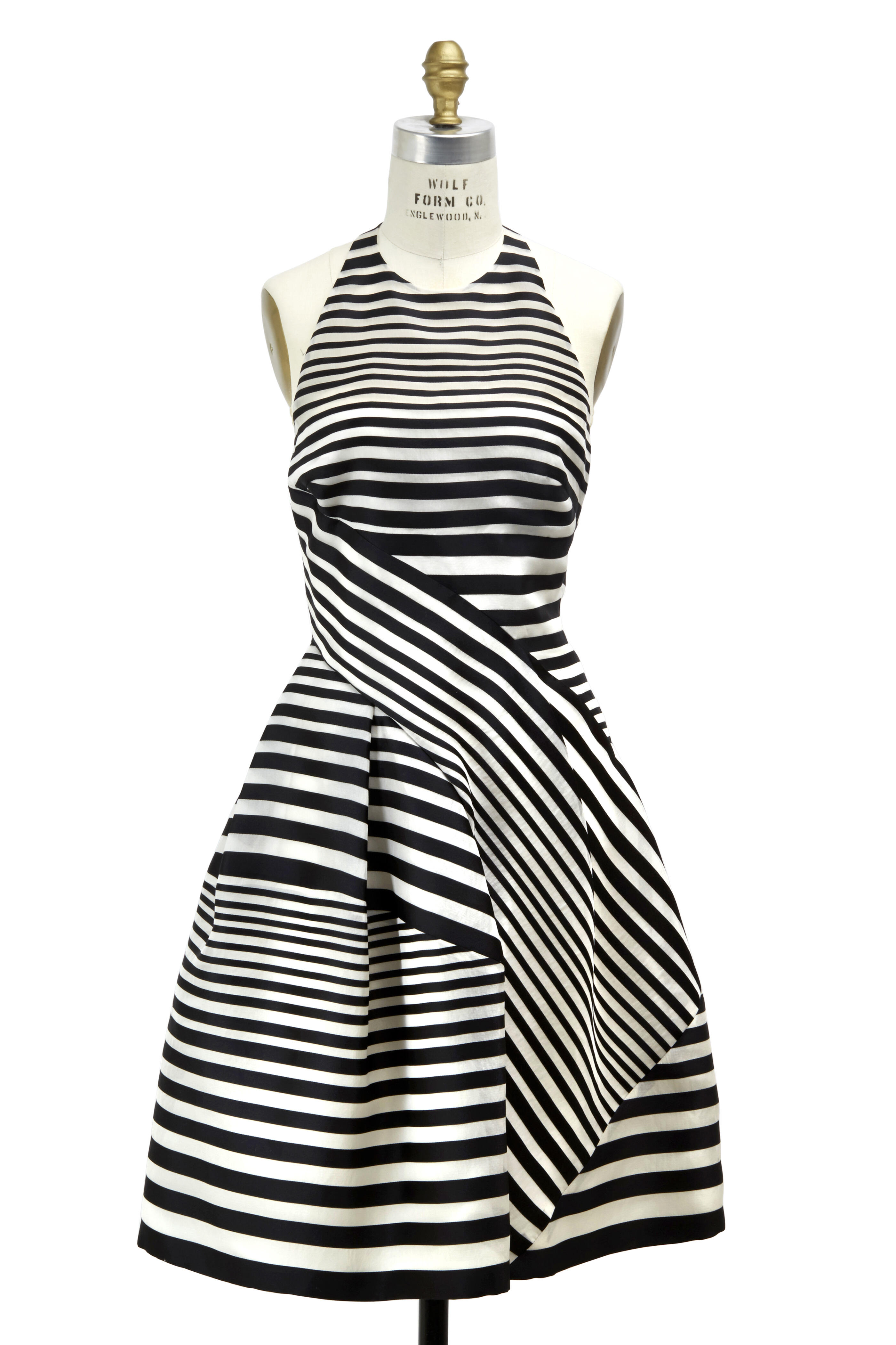 Summery and sharp, this eye-catching silk and polyethylene dress will be a favorite. It features the Riviera-stripe organza, the signature silk-corded center-back zip, as well as a hook and eye closure. The full skirt hits the at knee.