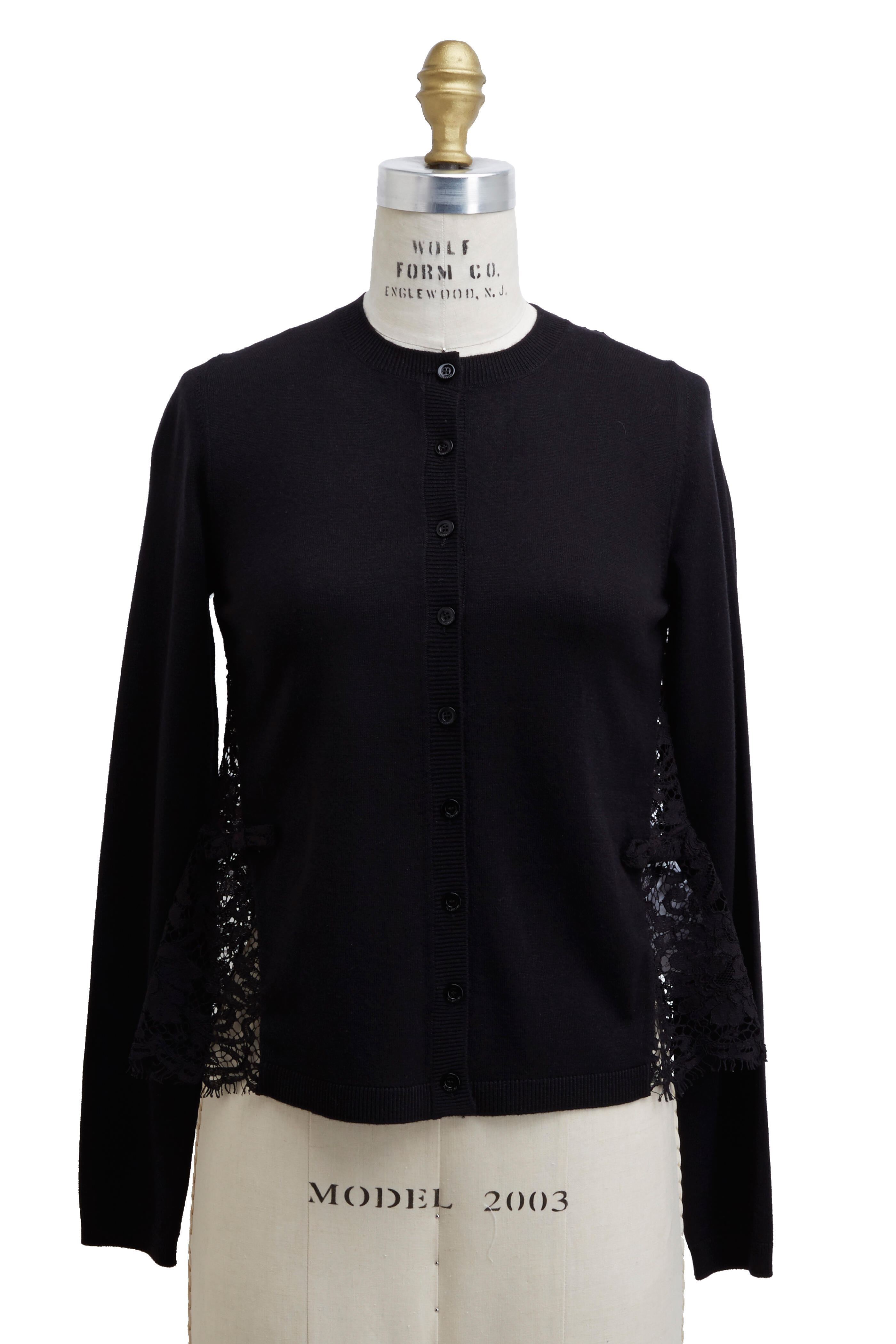 Step into Valentino's effortless-meets elevated cardigan. Flawless black virgin wool and cashmere compose the long sleeve style with ribbed crew neck, hem and cuffs. Delicate lace panels cut into the side and fill the back.