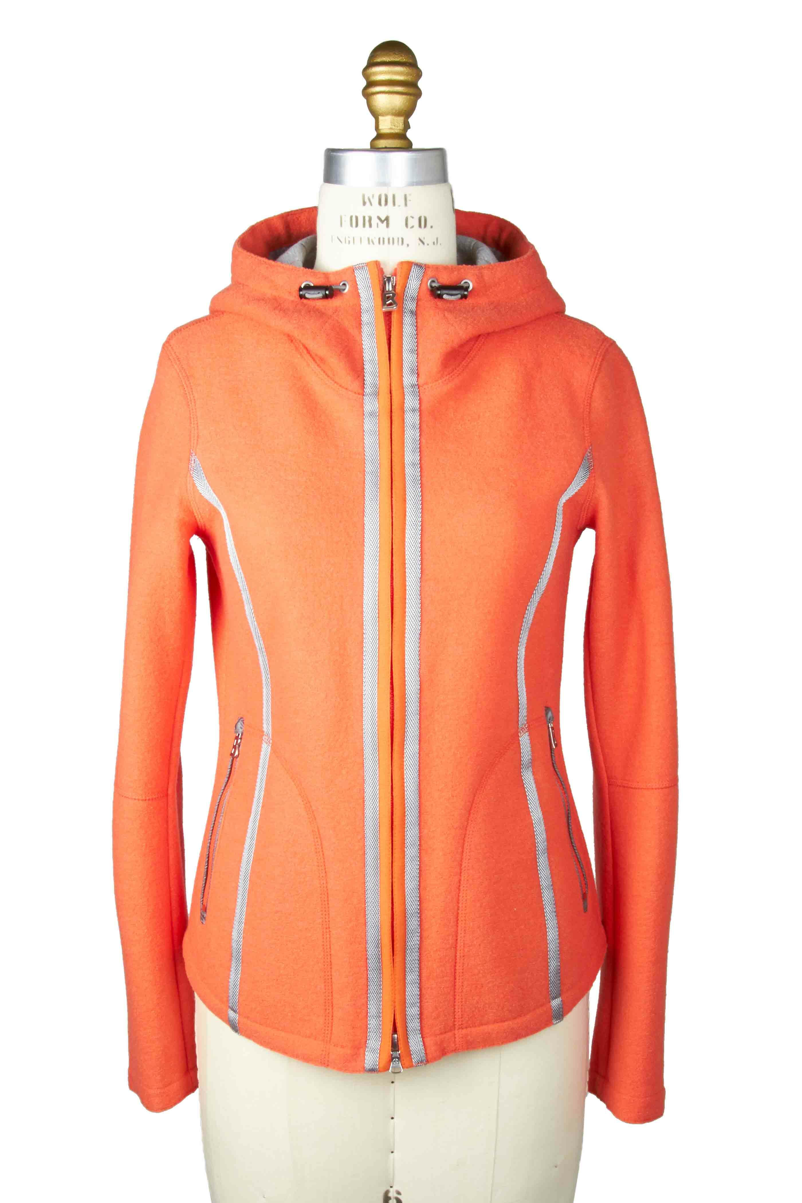 A bright and vibrant boiled orange jacket made out of boiled wool. The jacket features long sleeves, a full zip front closure and a concealed hoodie. It's a perfect jacket to wear on those cold days to stay warm and comfortable.