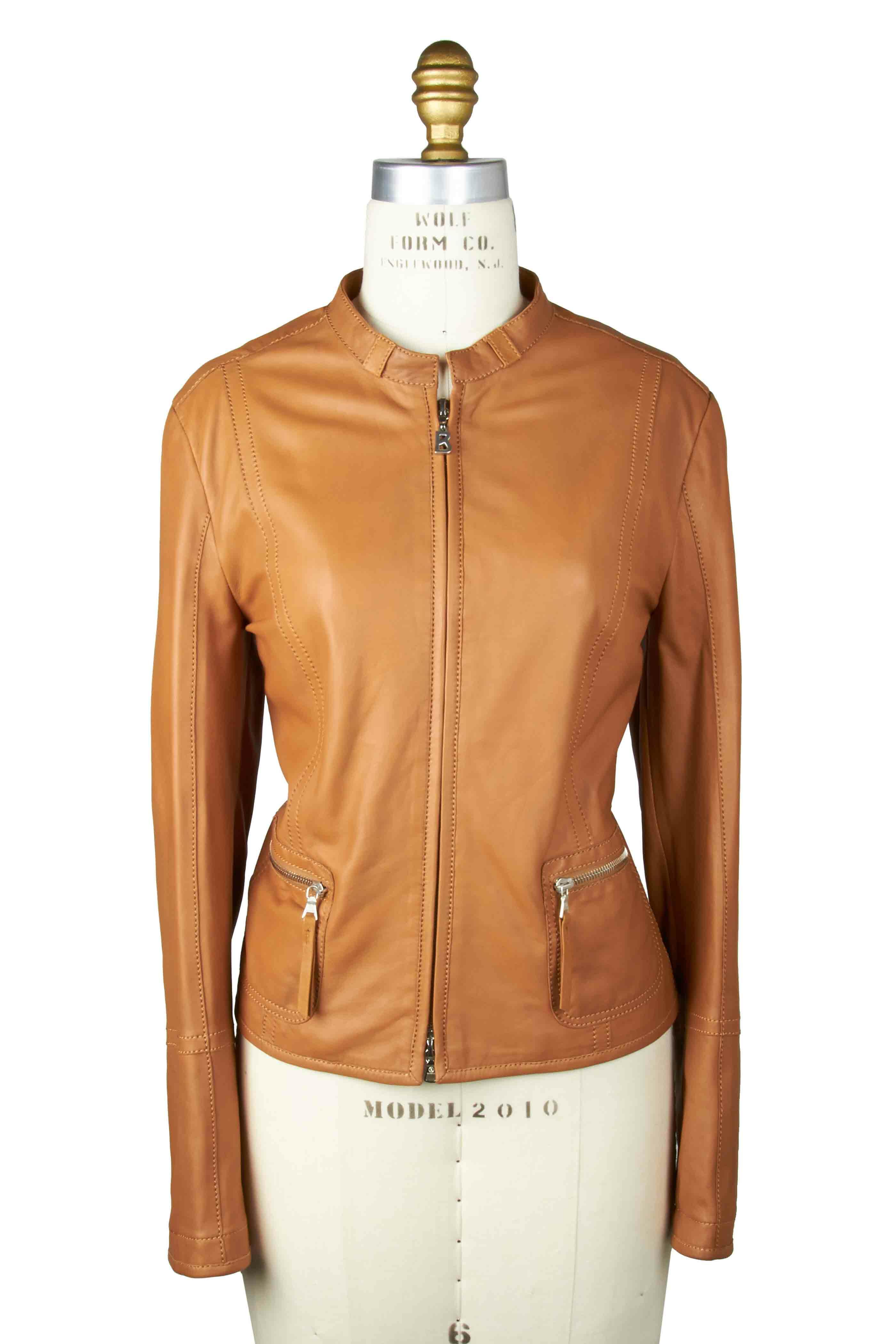 Sleek and smooth jacket in a cognac colored leather with long sleeves, a full front zip closure, and two pockets with a zip closure. It's the perfect jacket to wear during the spring on those cool days.