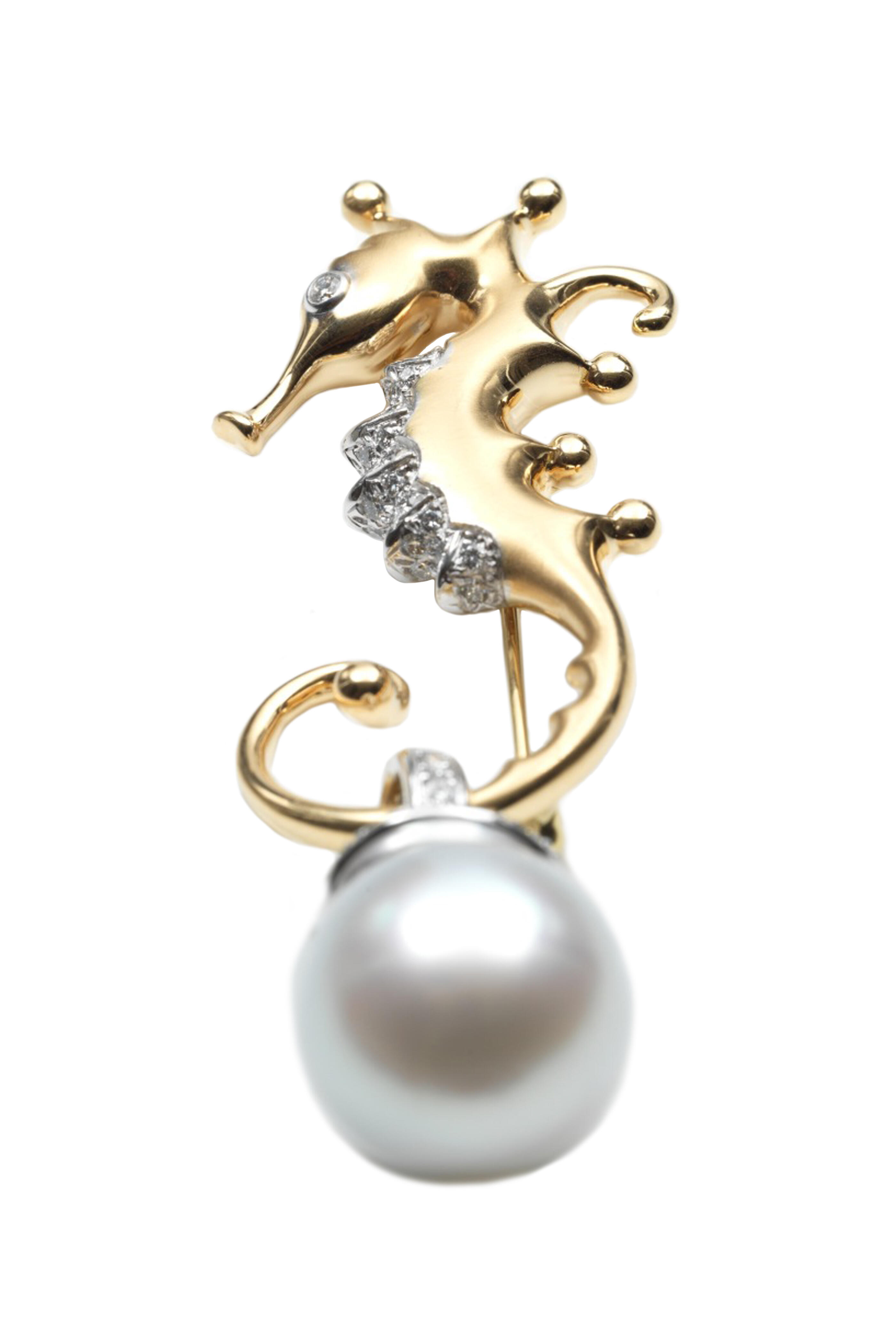 This charming seahorse is as beautiful as the underwater world it inhabits. Detailed yellow gold and silver form an intricate seahorse with sparkling white diamonds and a luscious, South Sea cultured pearl.