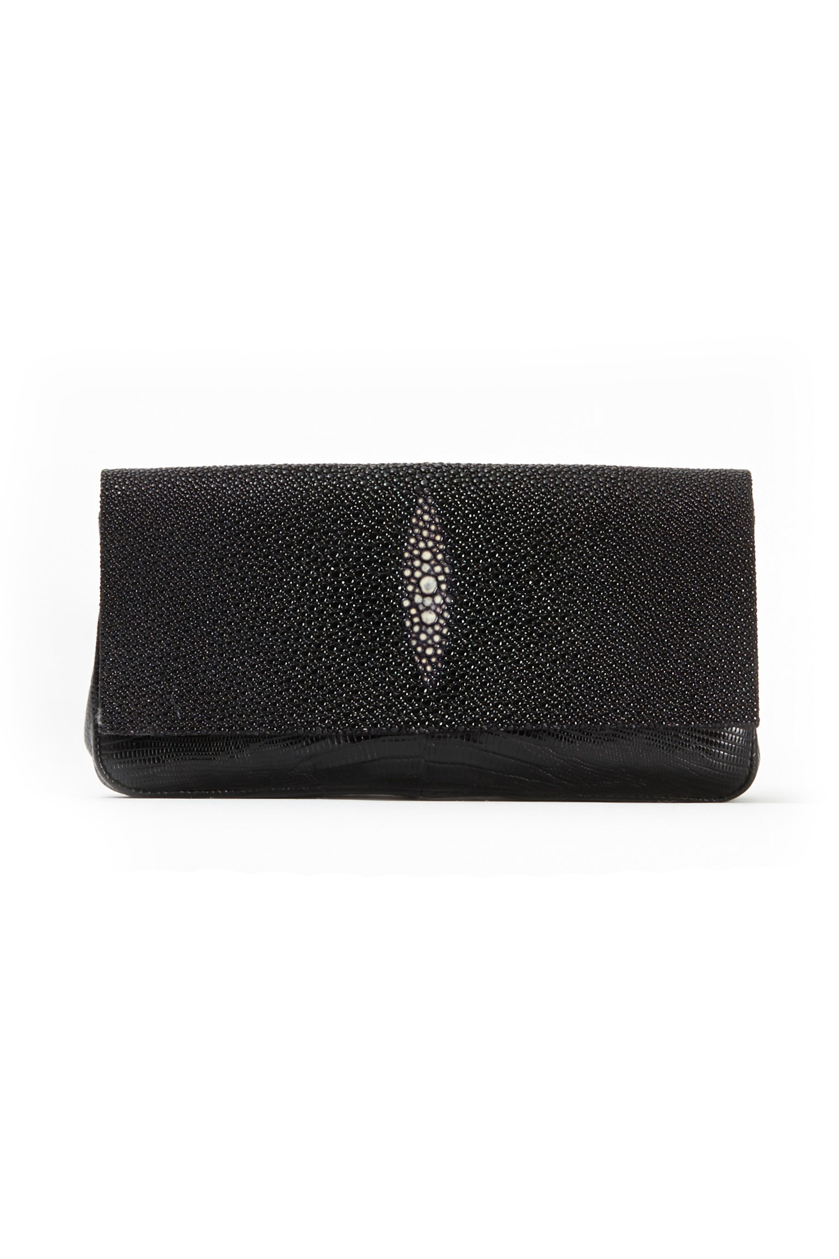 The Kate clutch features a combination of authentic stingray and lizard skins, with an oblong centered design that adds to the uniqueness of this coveted bag.