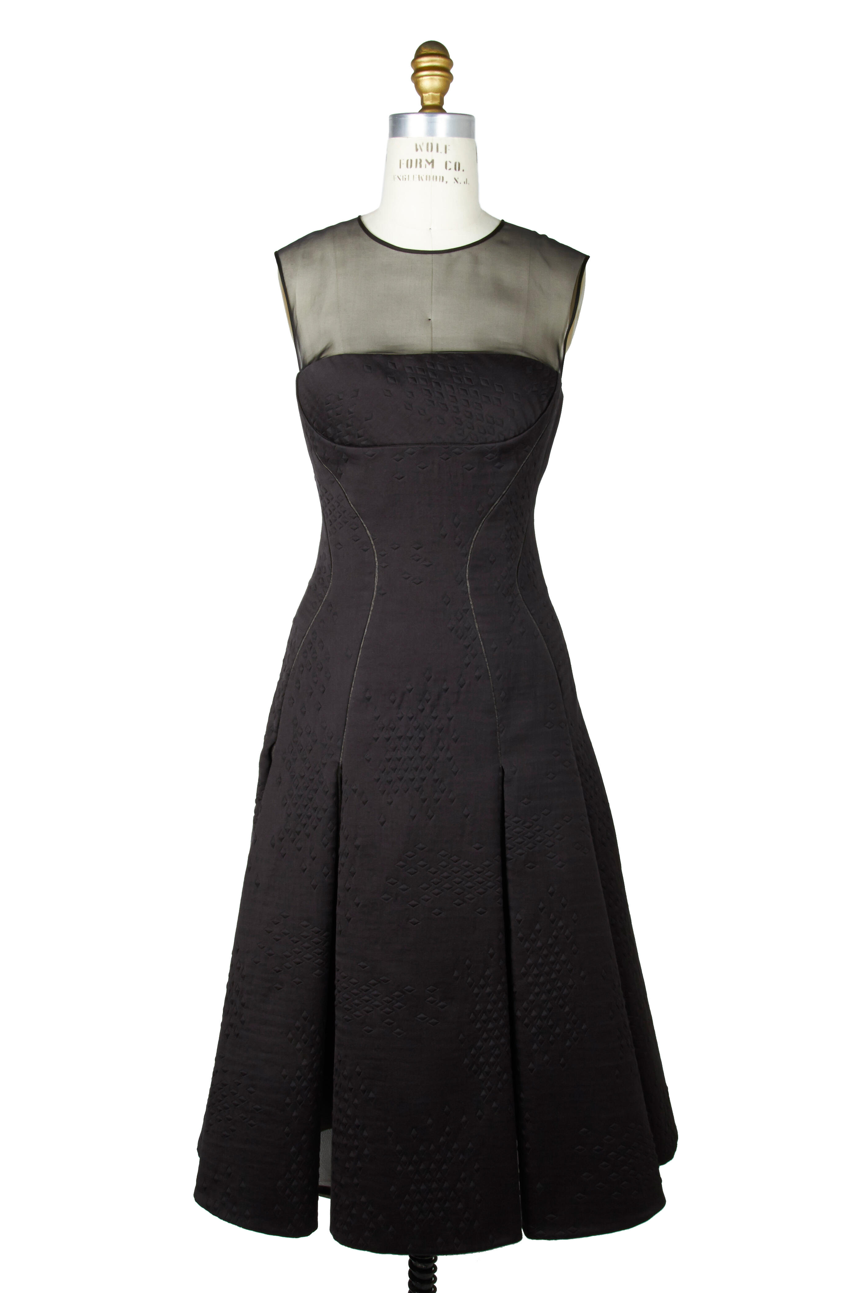 A sheer yoke plays well with a wide pleats, intersecting at femininely curved seams. Organza inserts fill out the voluminous skirt, while distinguished diamonds texturize the resolutely black jacquard.