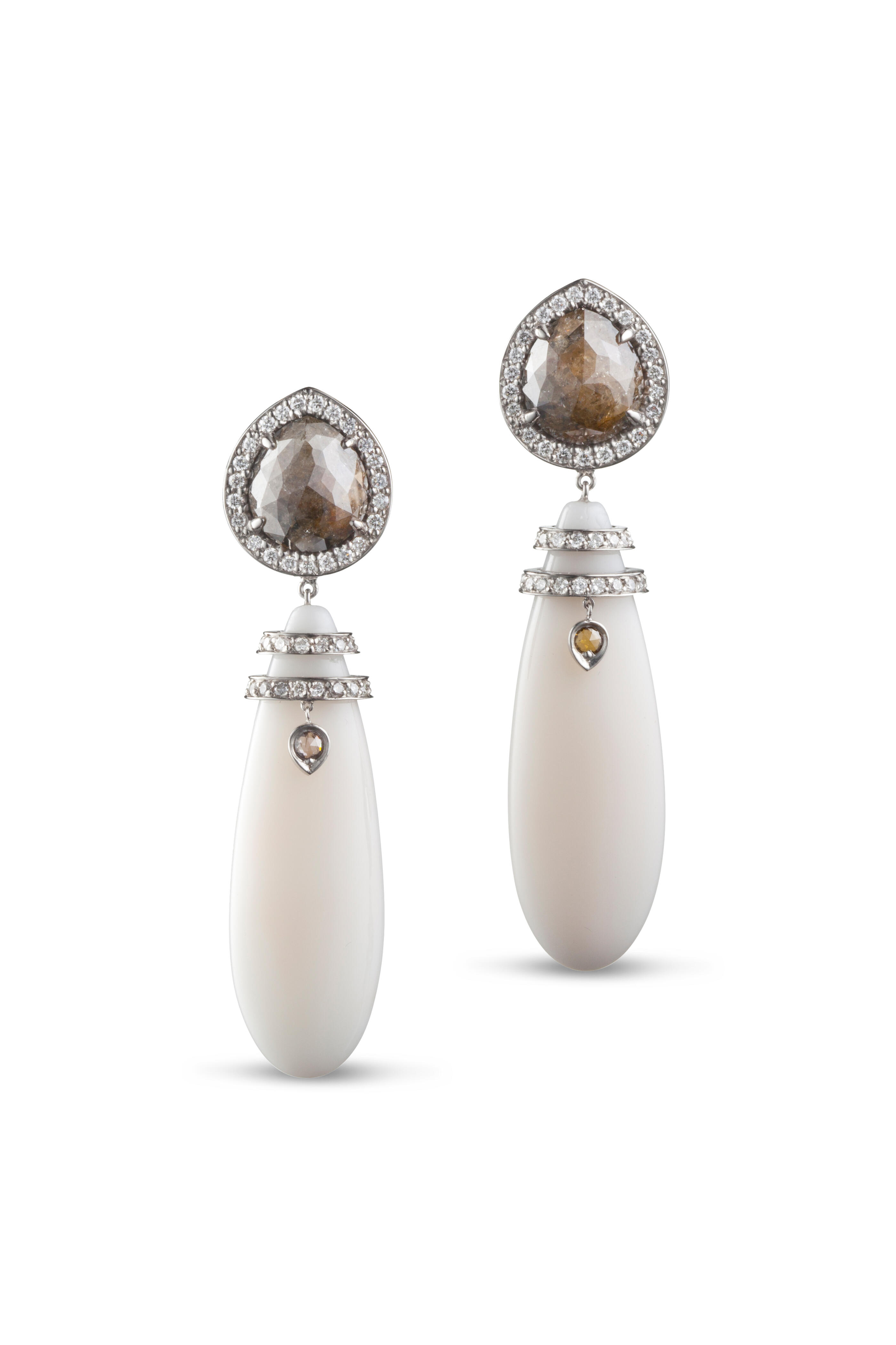 Platinum. 5.7cts grey diamonds. .92cts white diamonds. .8cts green / purple diamonds. Coral drop.