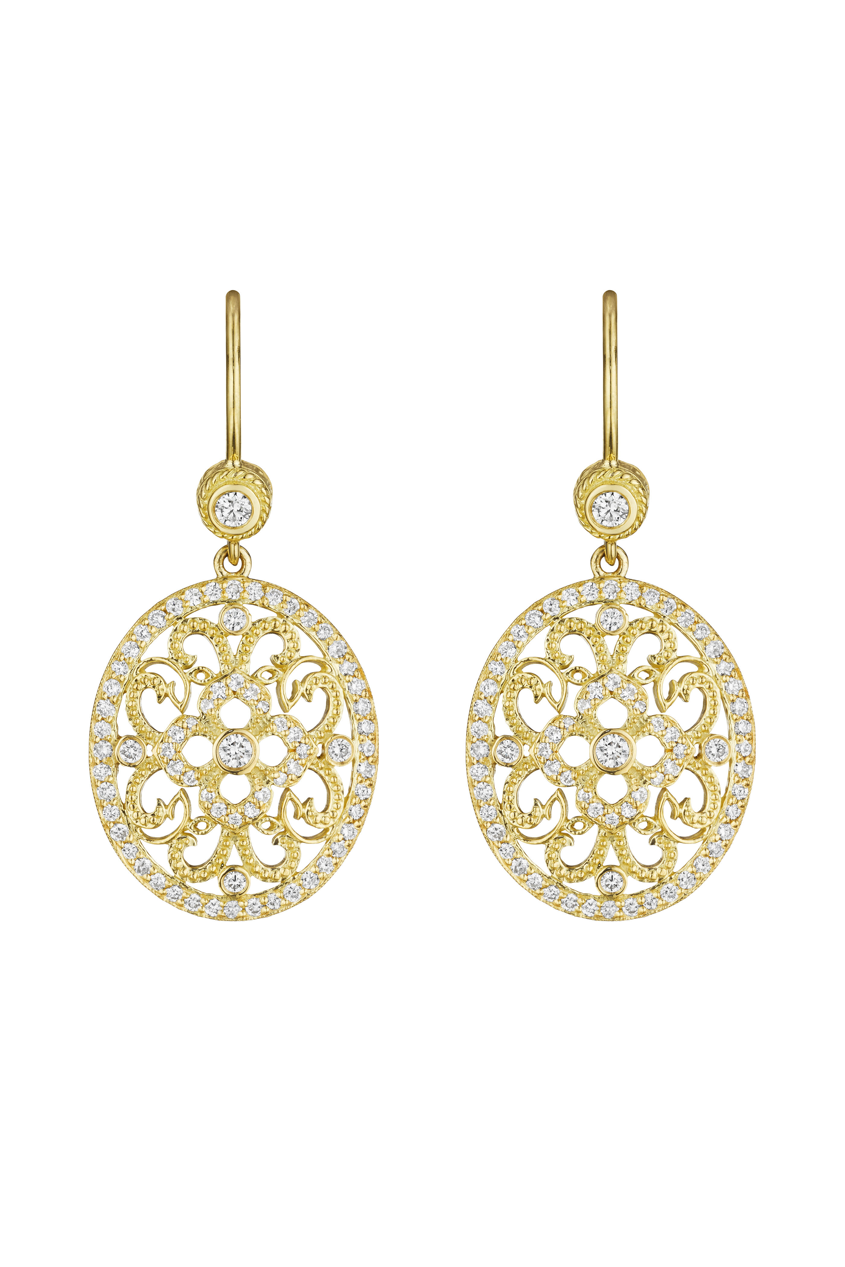 These 18k yellow gold dangle earrings offer a small, oval design with a symmetrical structure for a unique look to complement any outfit. They have a top bezel and french wire construction with .86ct of sparkling diamonds.