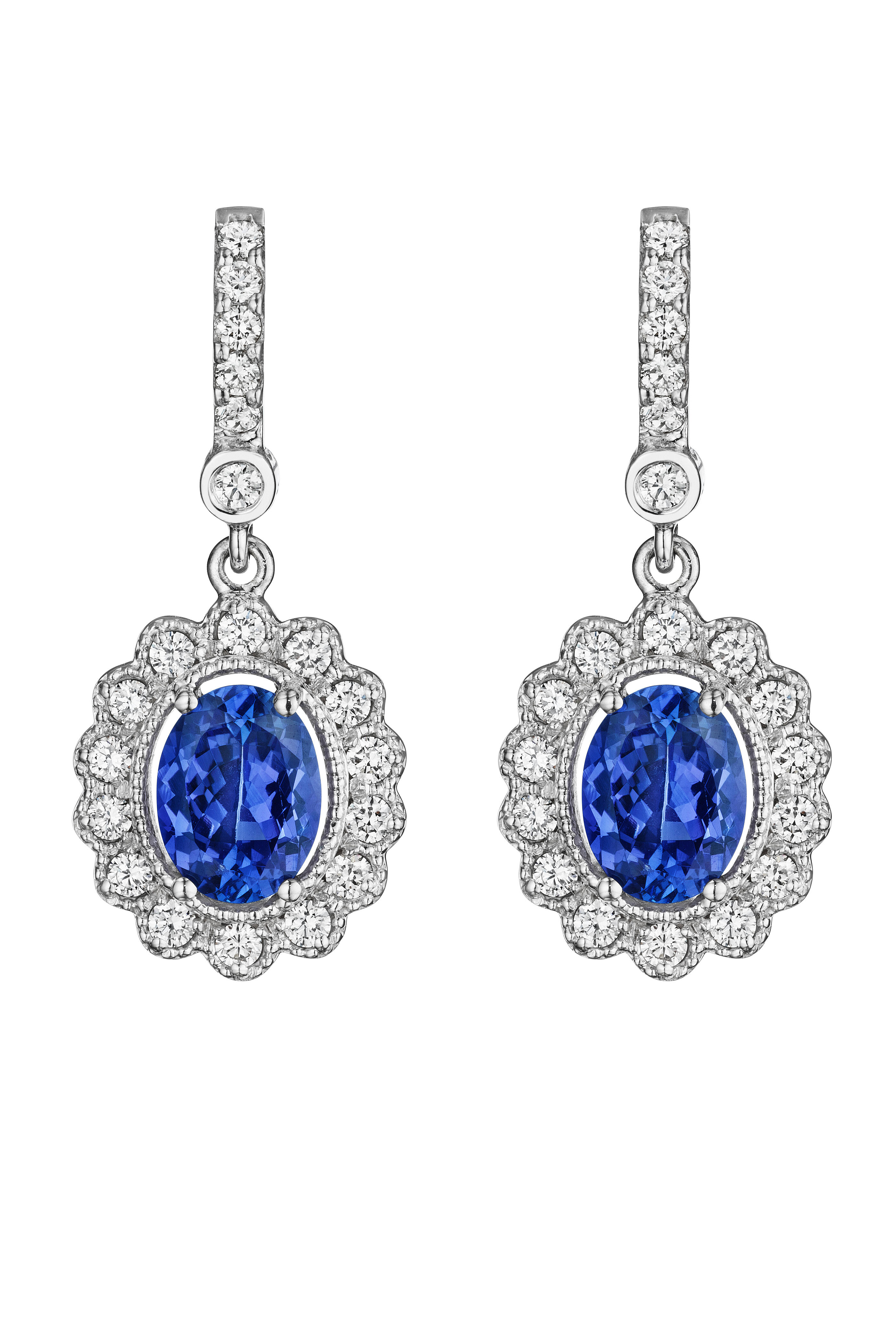 Elegant, timeless, and a beautiful blue color. What more could be said. 18k white gold diamond and 8x6 oval tanzanite earring with prong top (.80 ct diamonds 2.67ct tanzanite)