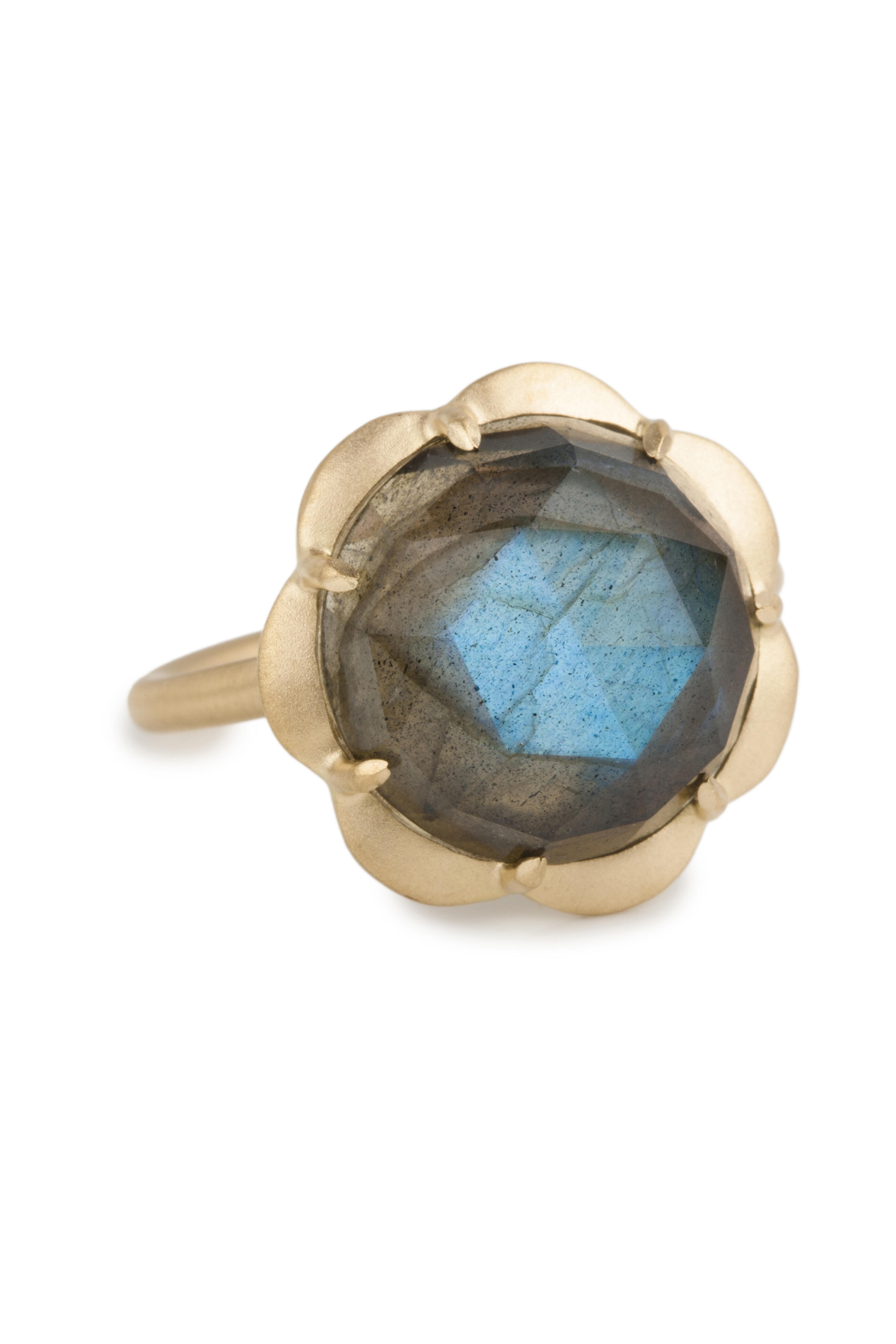 A beautiful labradorite gemstone rests in the center of this elegant, 18k yellow gold, large, scallop drop ring.