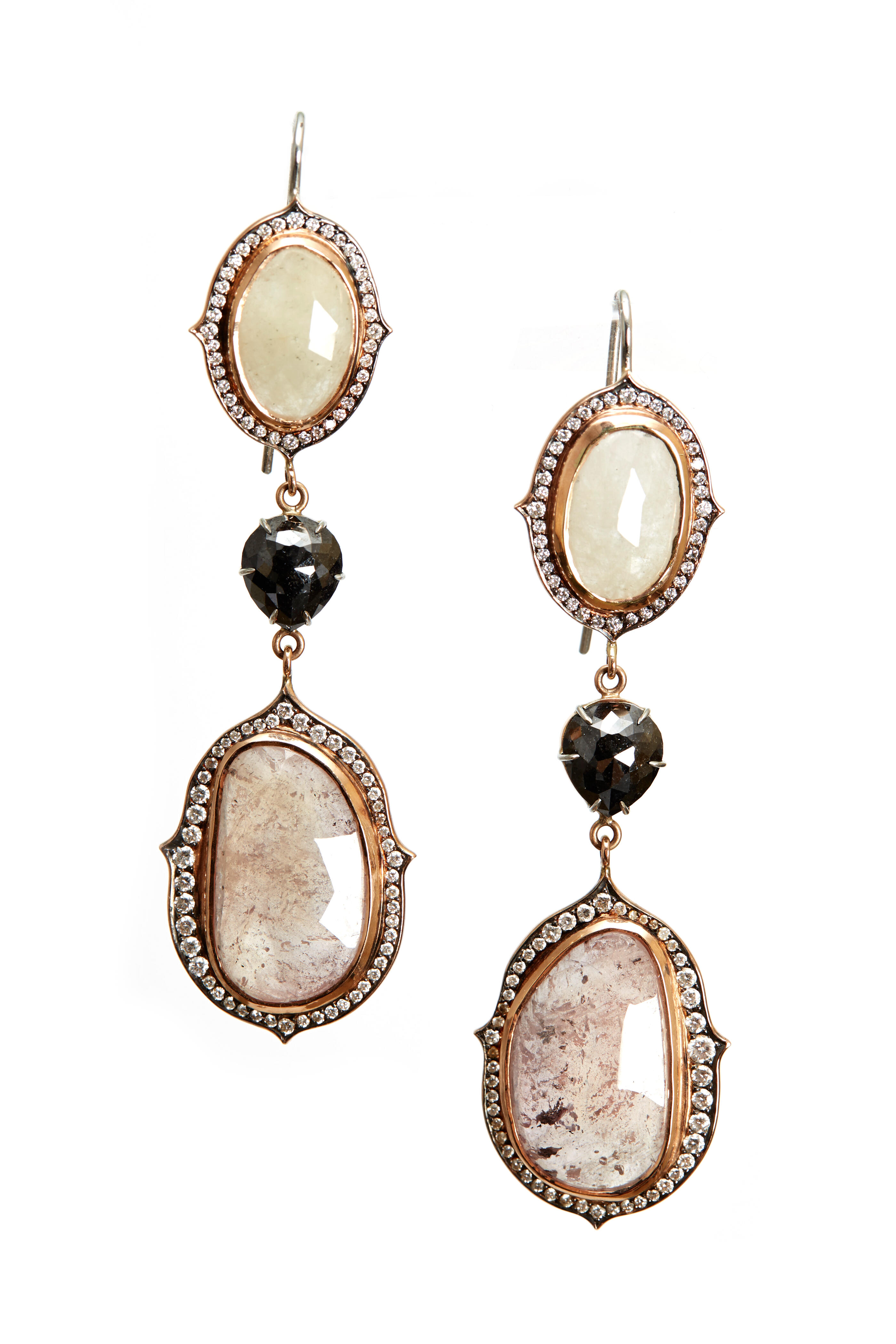 These eloquent and feminine earrings are crafted with sapphire gemstones accented by black and white diamonds set in warm 14k rose gold and icy platinum in a lovely design.