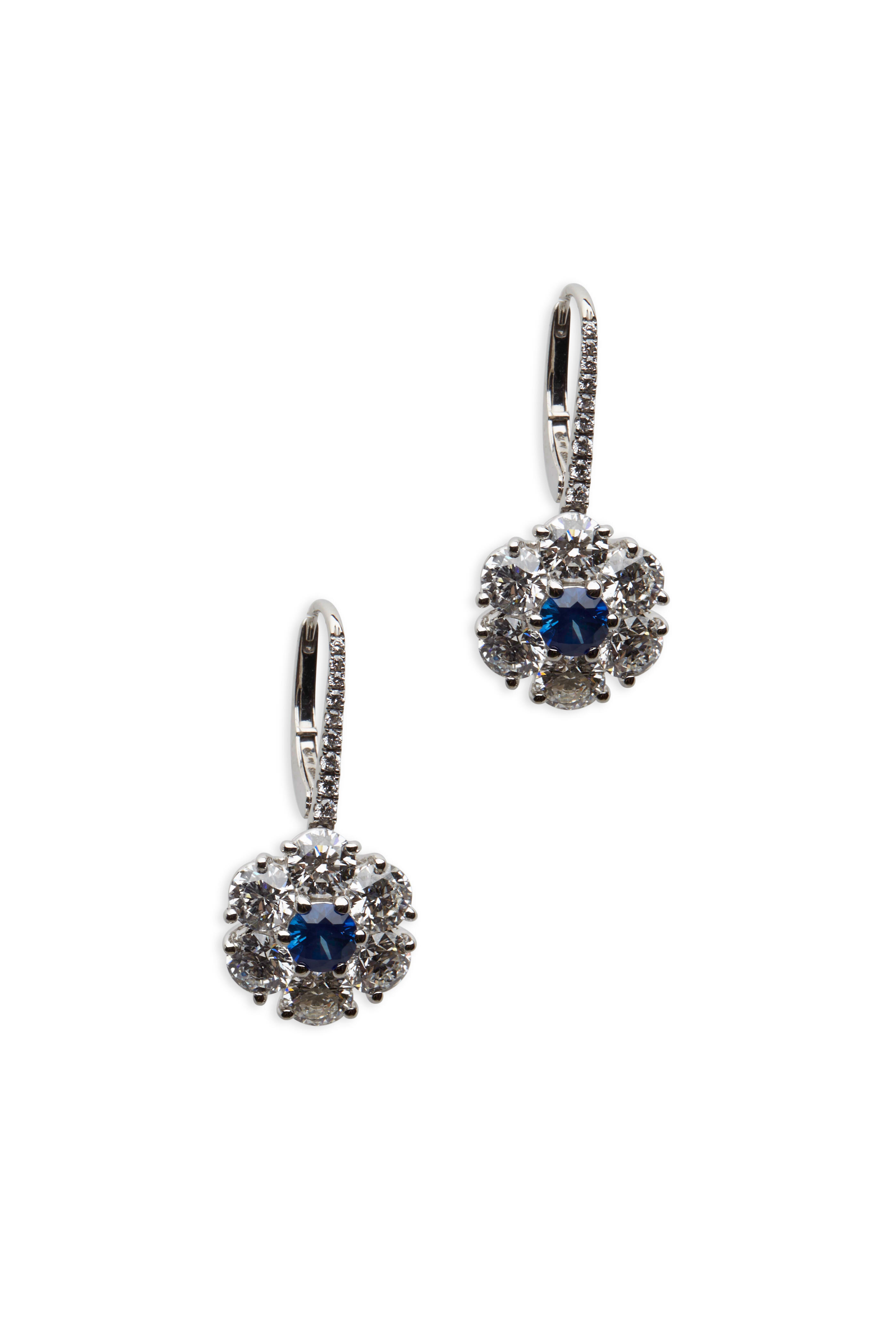 Glittering and gorgeous, these diamond earrings are a shining treat. A romantic floral motif with a royal blue gemstone nestling between scintillating white diamonds.