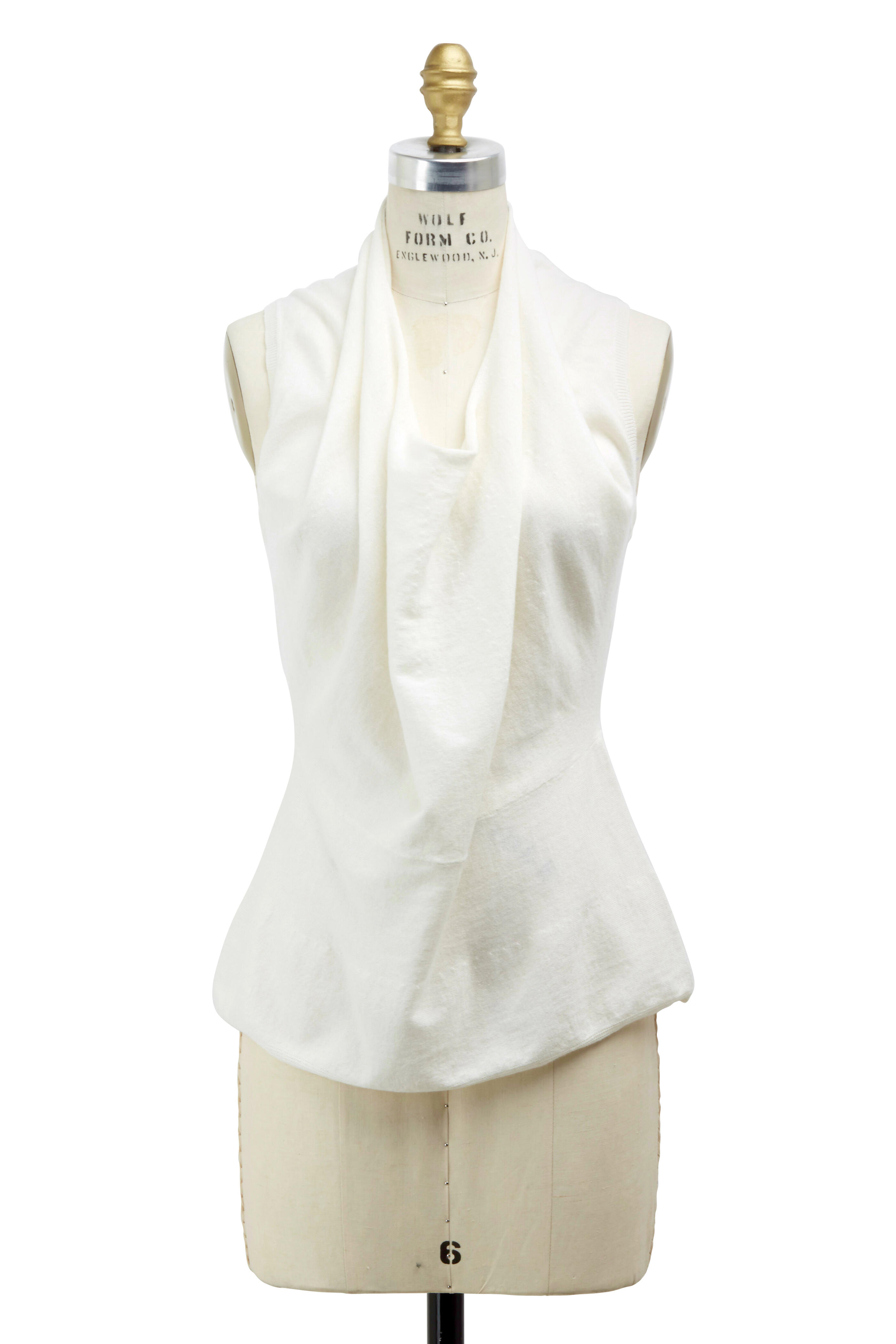 Cowl neckline. Sleeveless. 70% cotton, 30% cashmere. Dry clean.