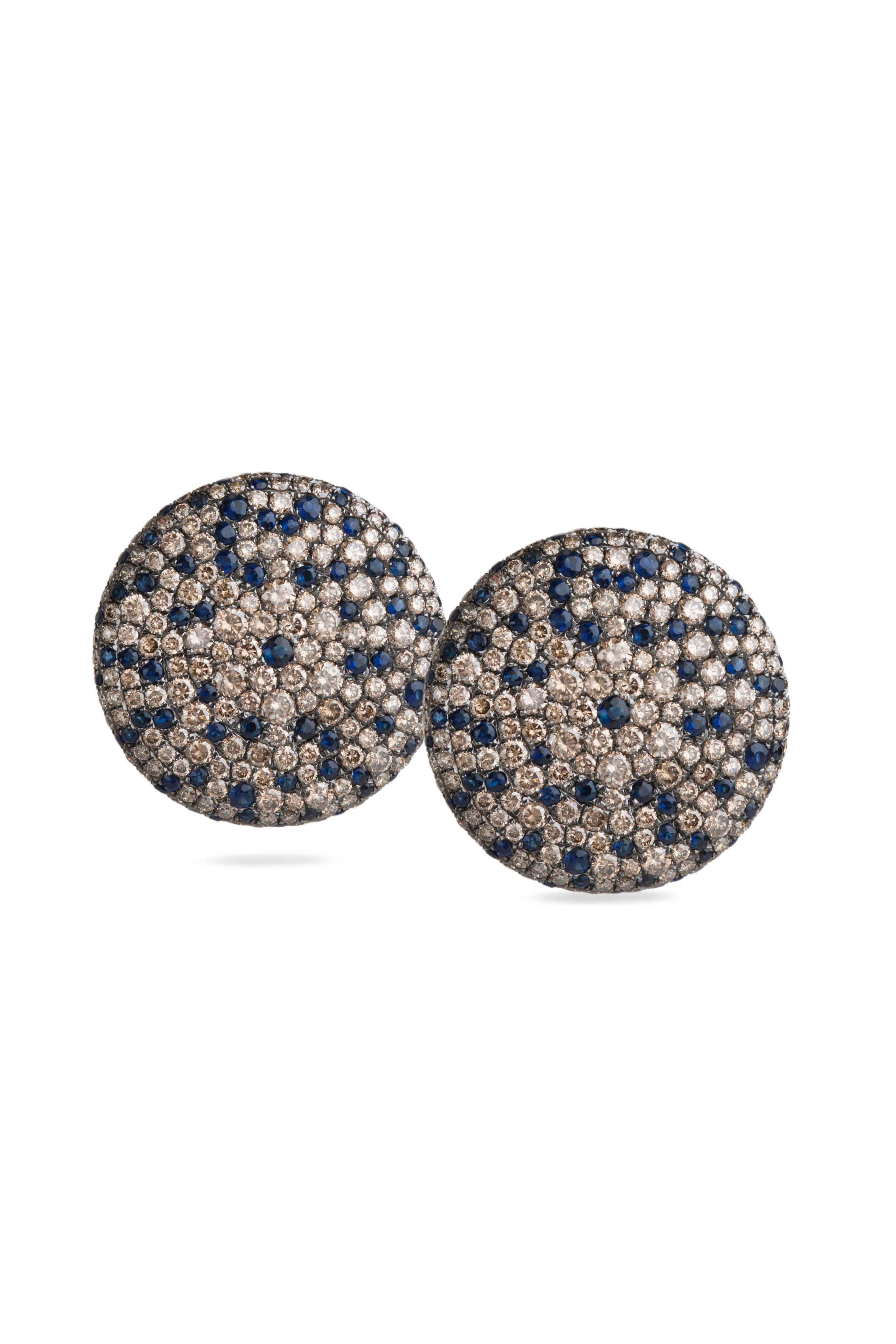Complete your look with these 18k white gold earrings that are covered in brown diamonds and blue sapphires.