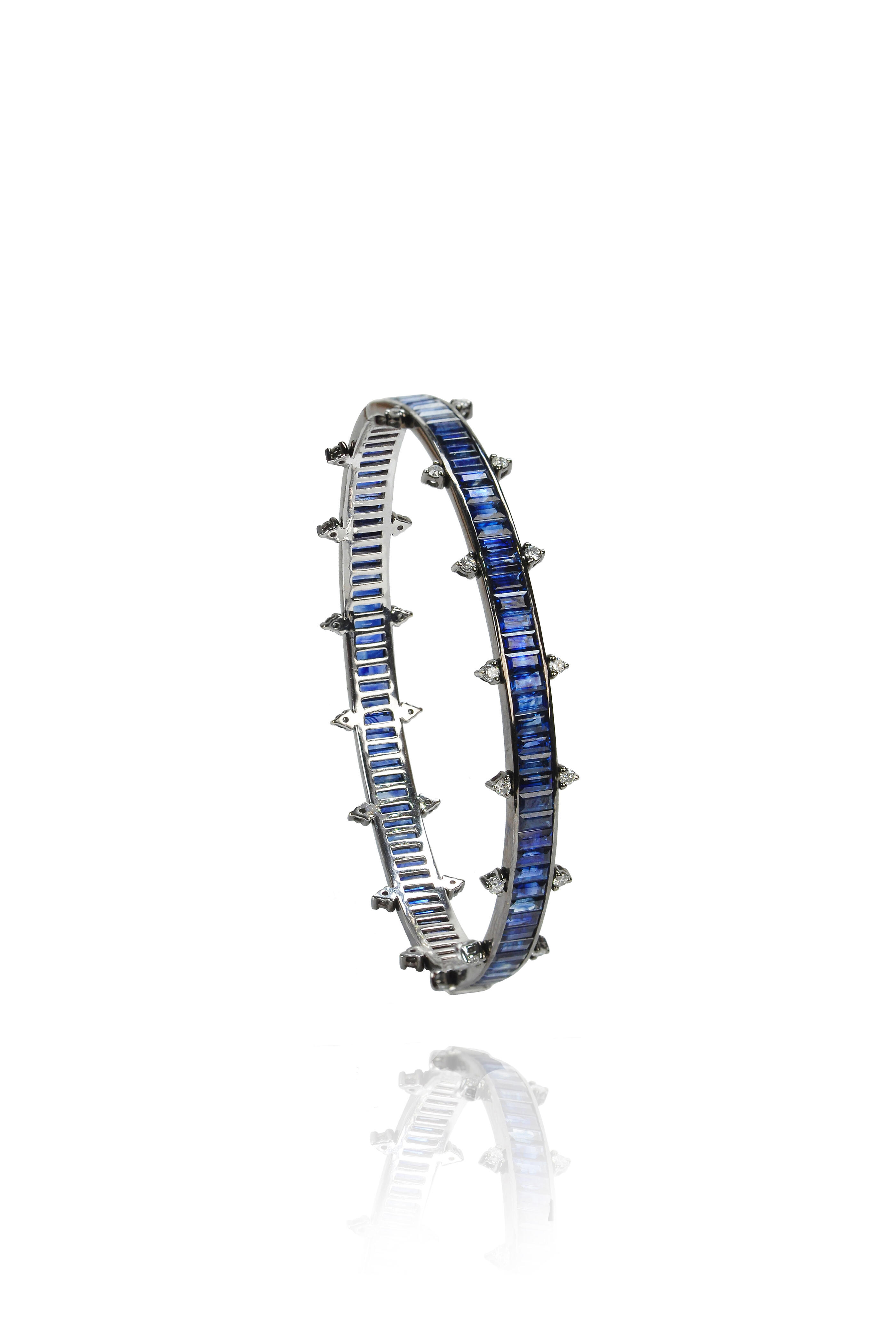 18k white gold. Baguette-cut blue sapphire gemstones. White diamonds. Bangle bracelet.