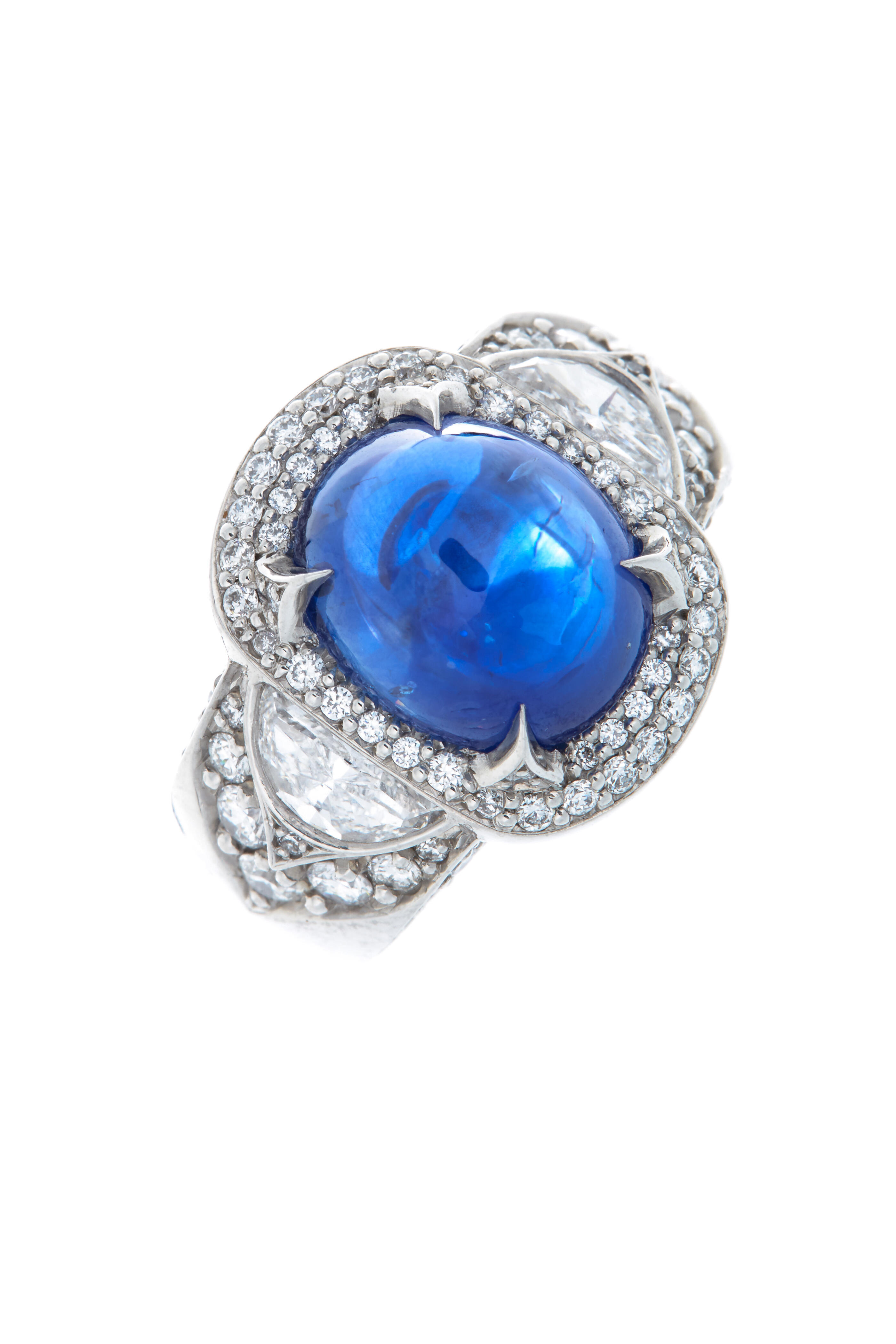 Platinum. Sapphire, 9.11 total carat weight. Diamonds, 0.82 total carat weight. Halfmoon-cut diamonds, 0.67 total carat weight.
