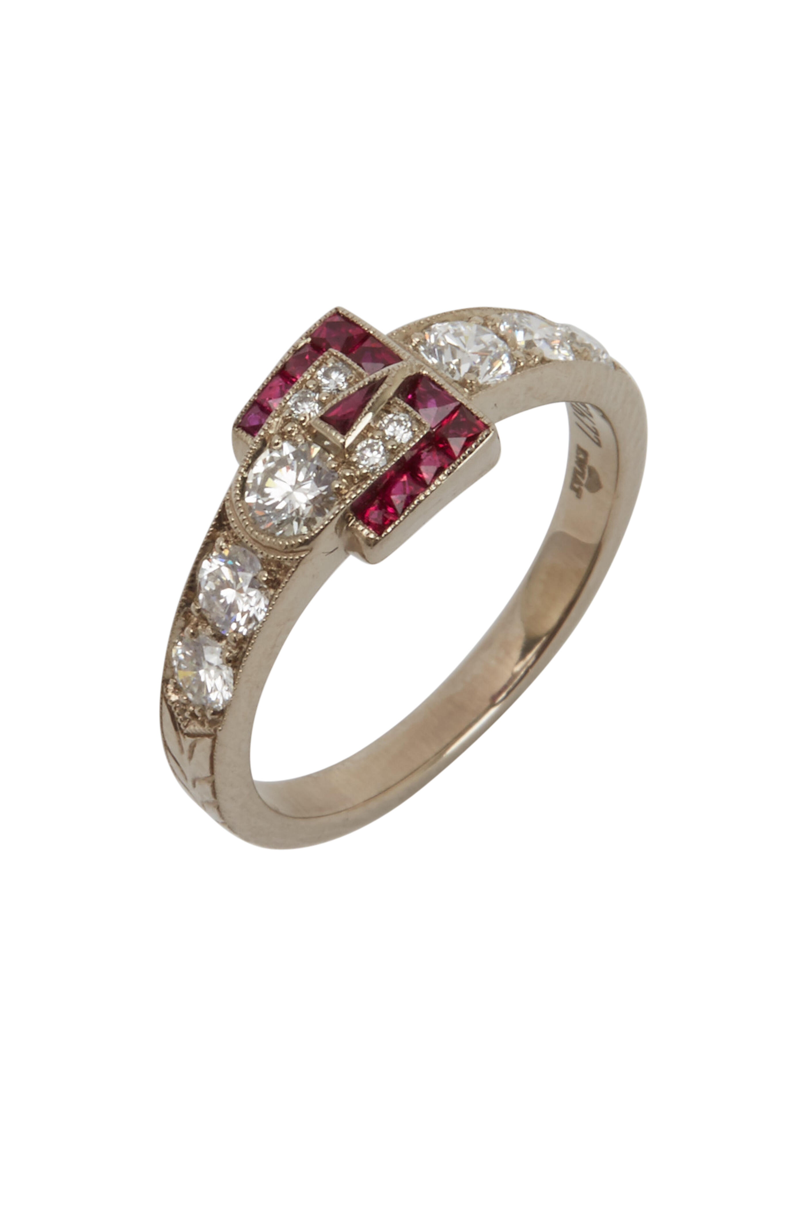 18k white gold. 0.64cts color: GH / clarity: VS1-2; (10) round, brilliant-cut white diamonds. Red ruby gemstones. Buckle ring.
