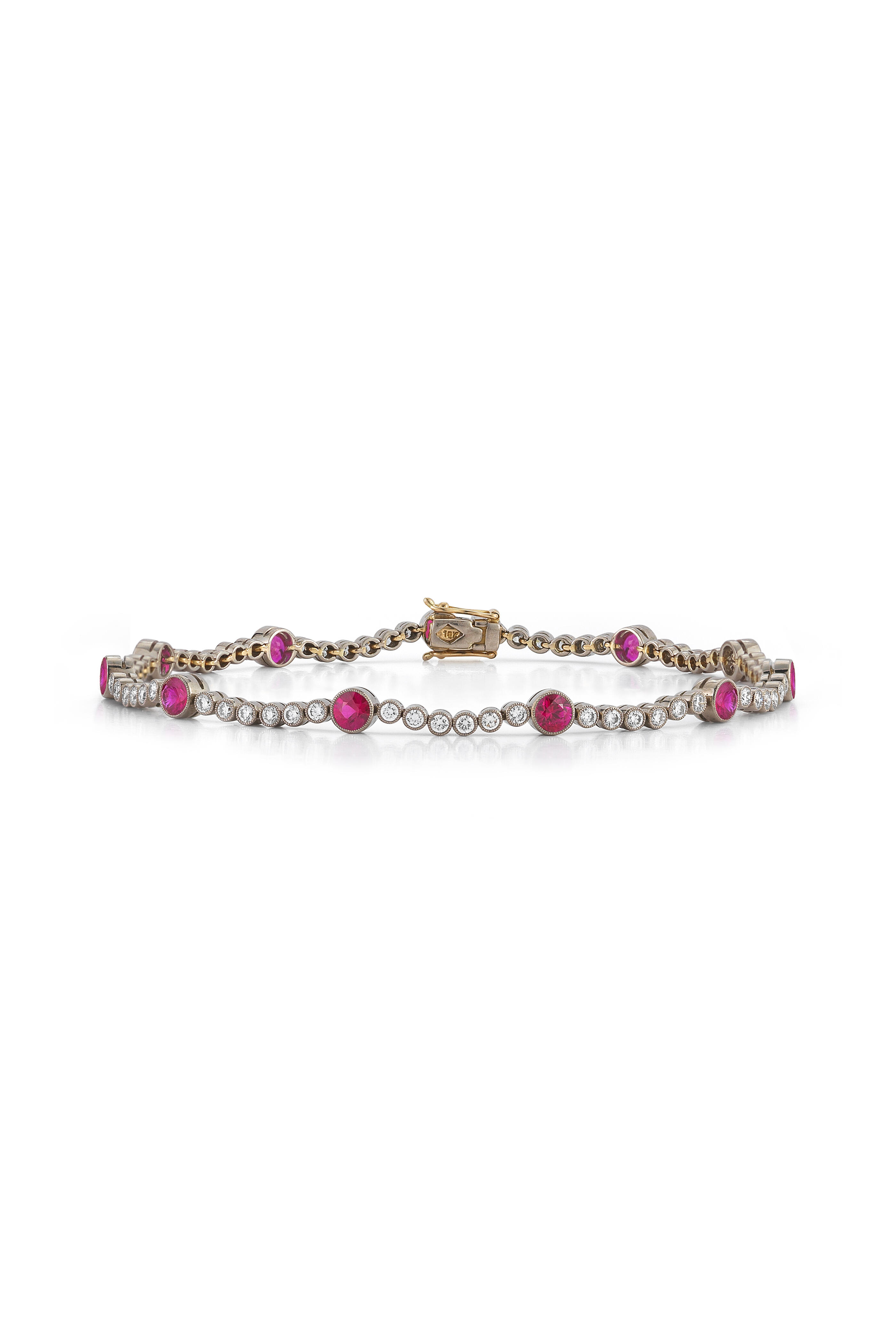 This remarkable white gold piece offers a vintage twist on the classic line bracelet. Round brilliant-cut white diamonds alternate and perfectly accent passionate, brilliant rubies.