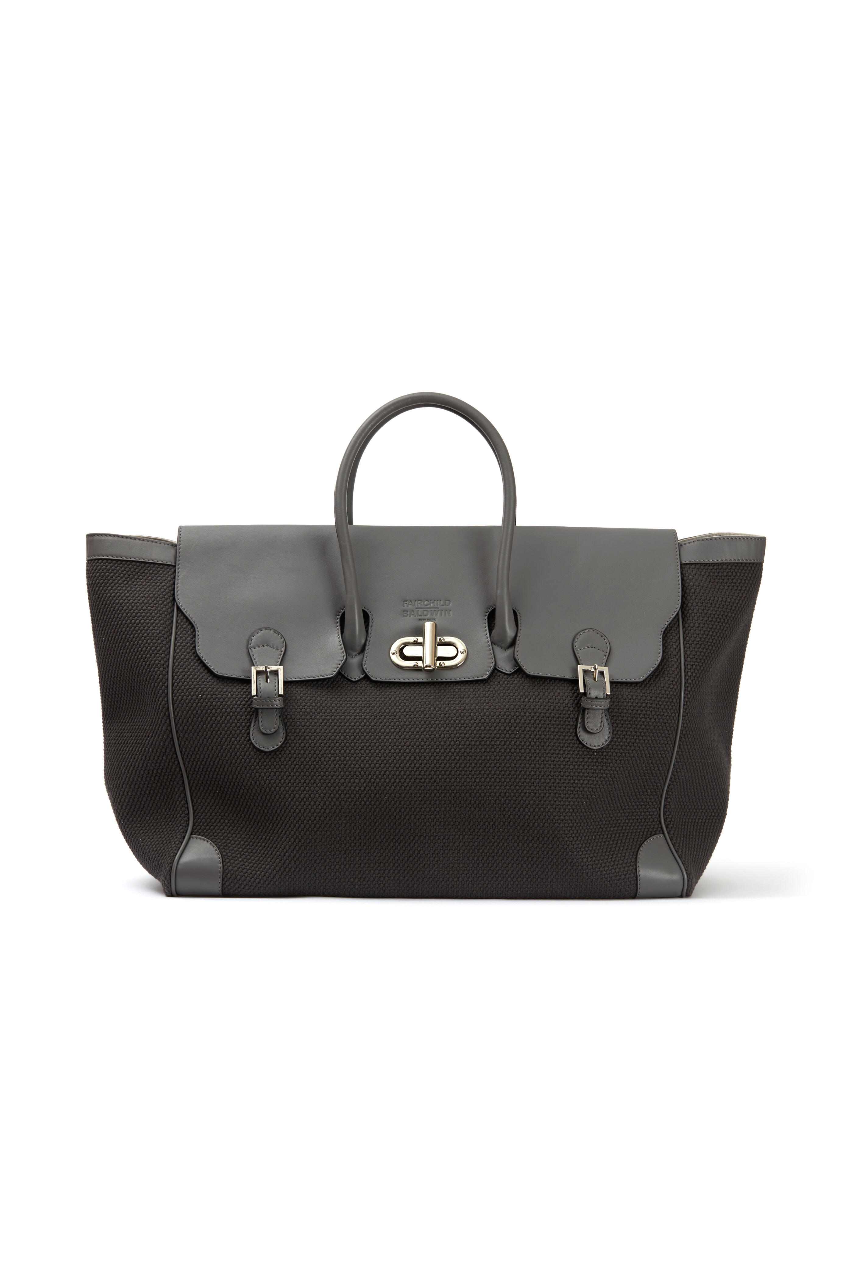 This is the perfect bag for showing off your style and practicality. The body is crafted out of a grey canvas while the flap and top handle is made out of a grey leather. The flap has a two buckle strap closure with a turn lock closure as well.
