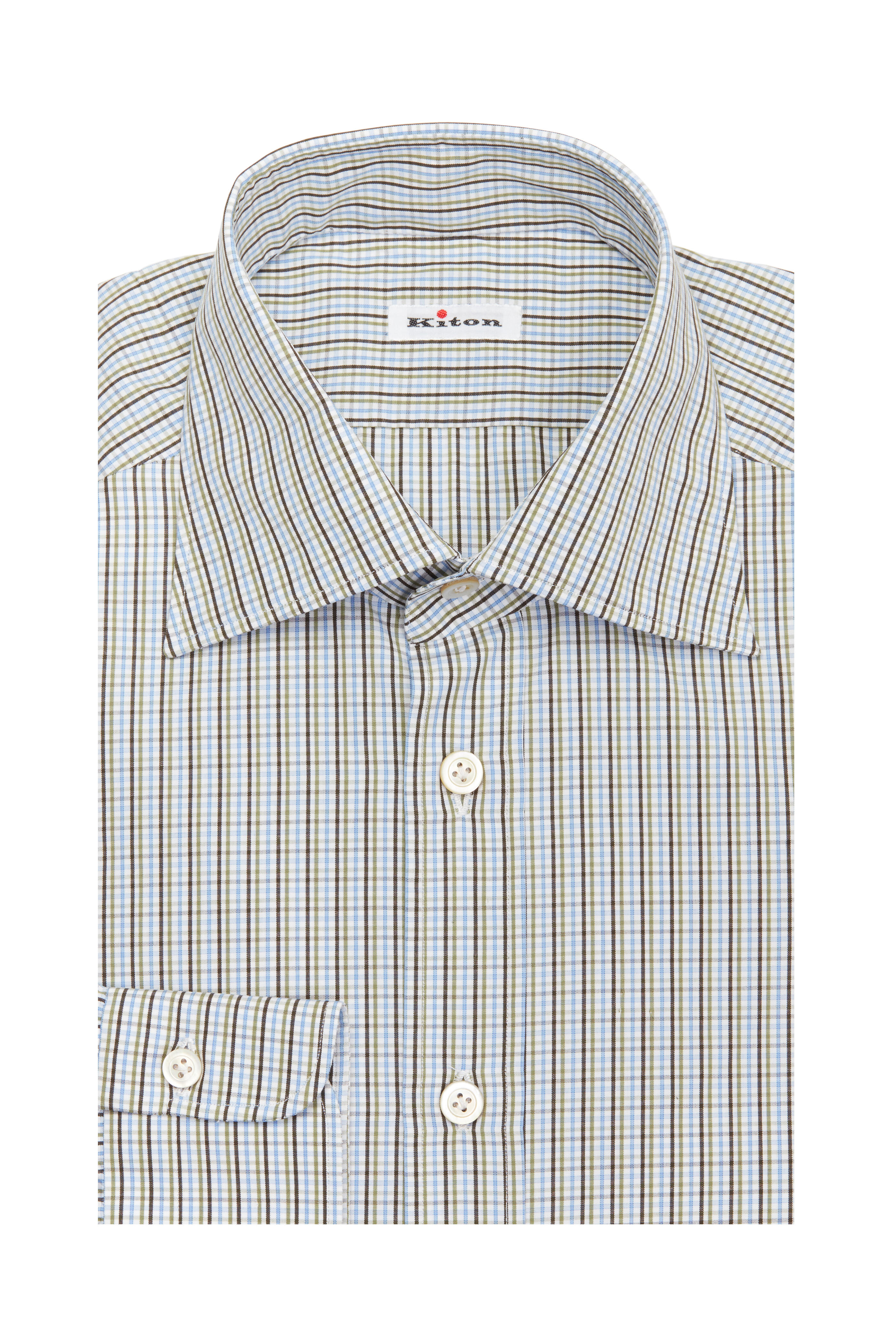 Tattersall pattern. Spread collar. Single button barrel cuffs. Made in Italy. 100% Cotton. Machine wash.