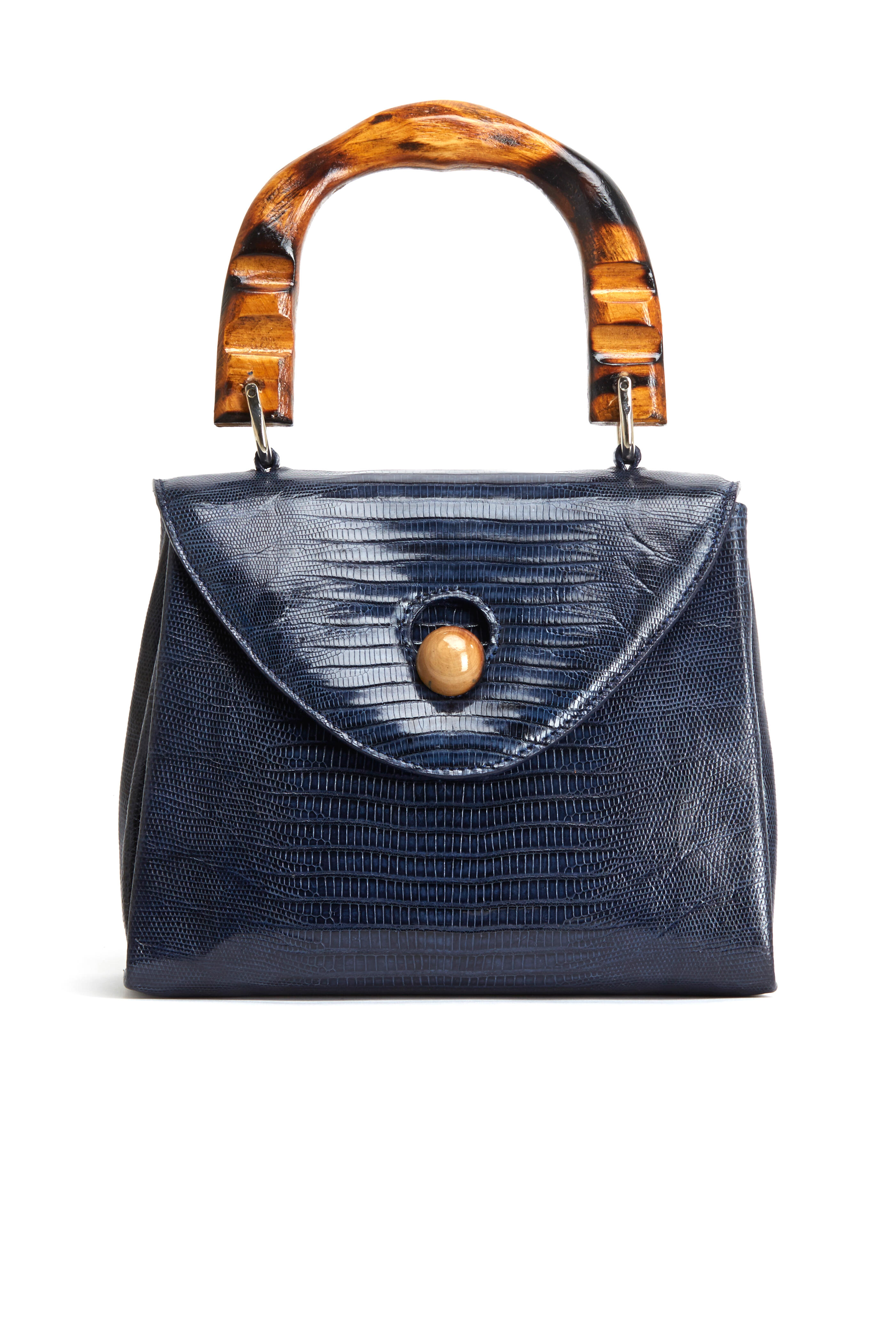 A beautiful handbag made in a navy blue lizard skin leather that is complemented with a natural bamboo handle for a modern look that will perfectly accessorize your outfit.