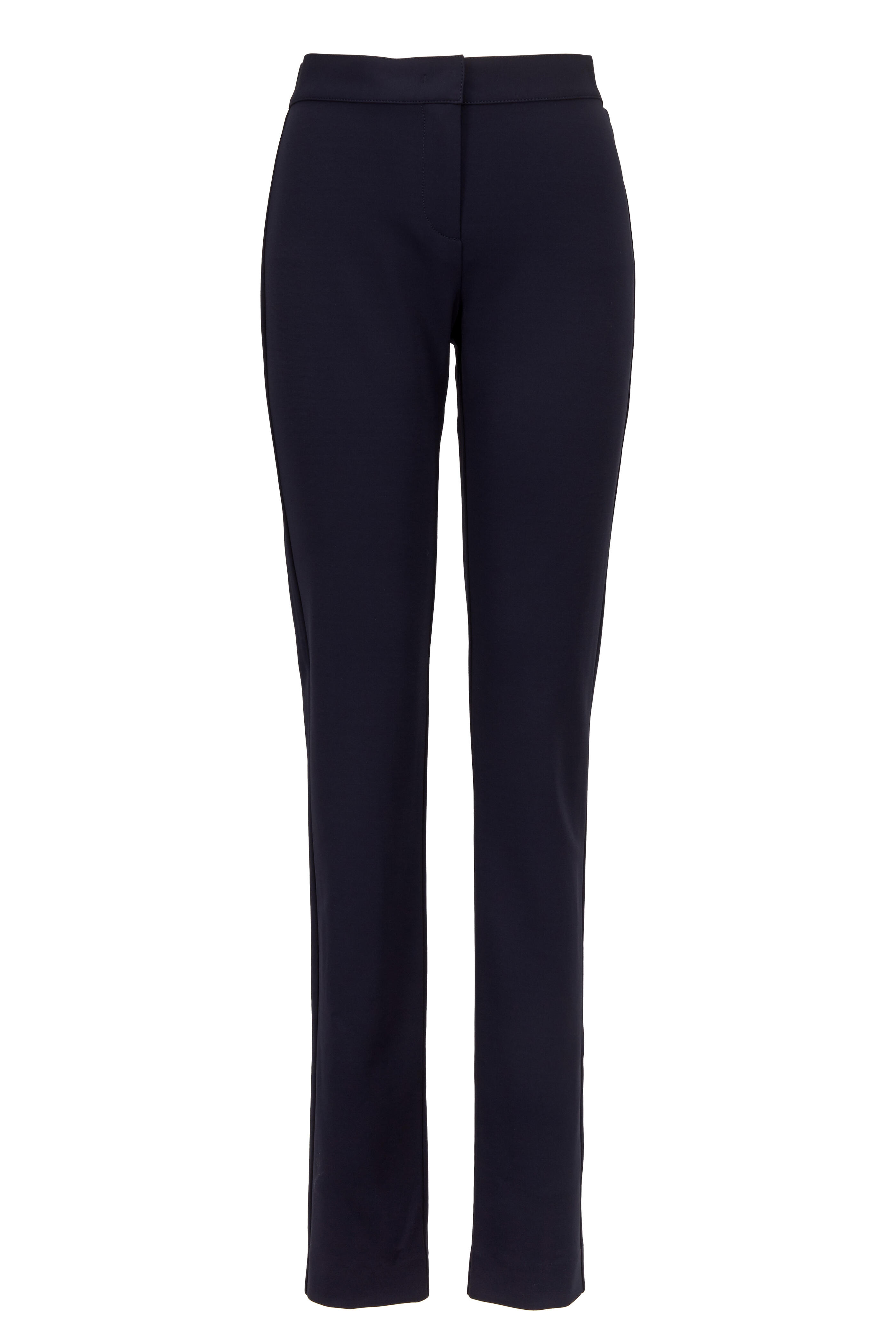 Waistband; hook and eye fly. Back panels. Fabric from Italy. 83% viscose-rayon, 12% polyamide-nylon, 5% elastane. Dry clean.
