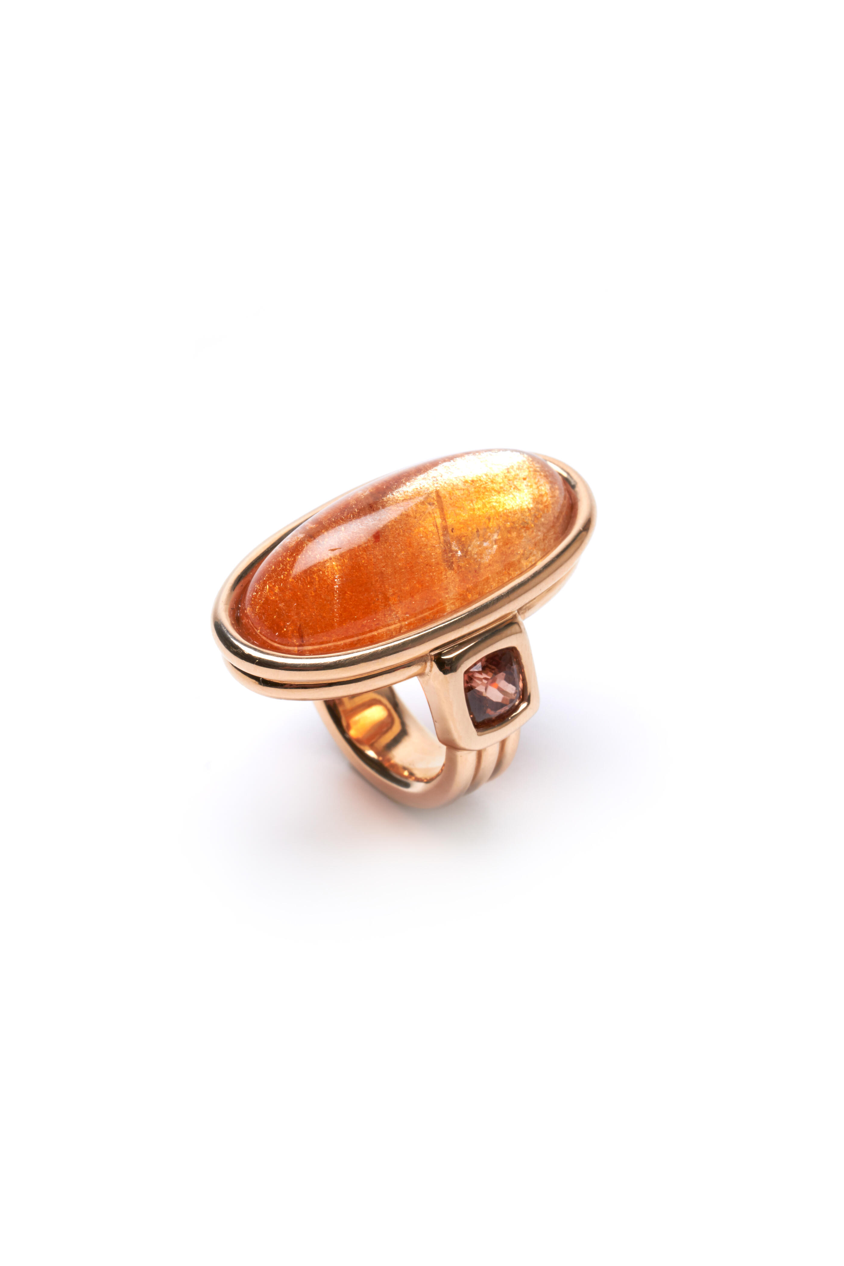 Heavenly honey hues add warmth to this lovely cocktail ring! The band is fitted with zircon and a magnificent peach sunstone that radiate with a warm glow.