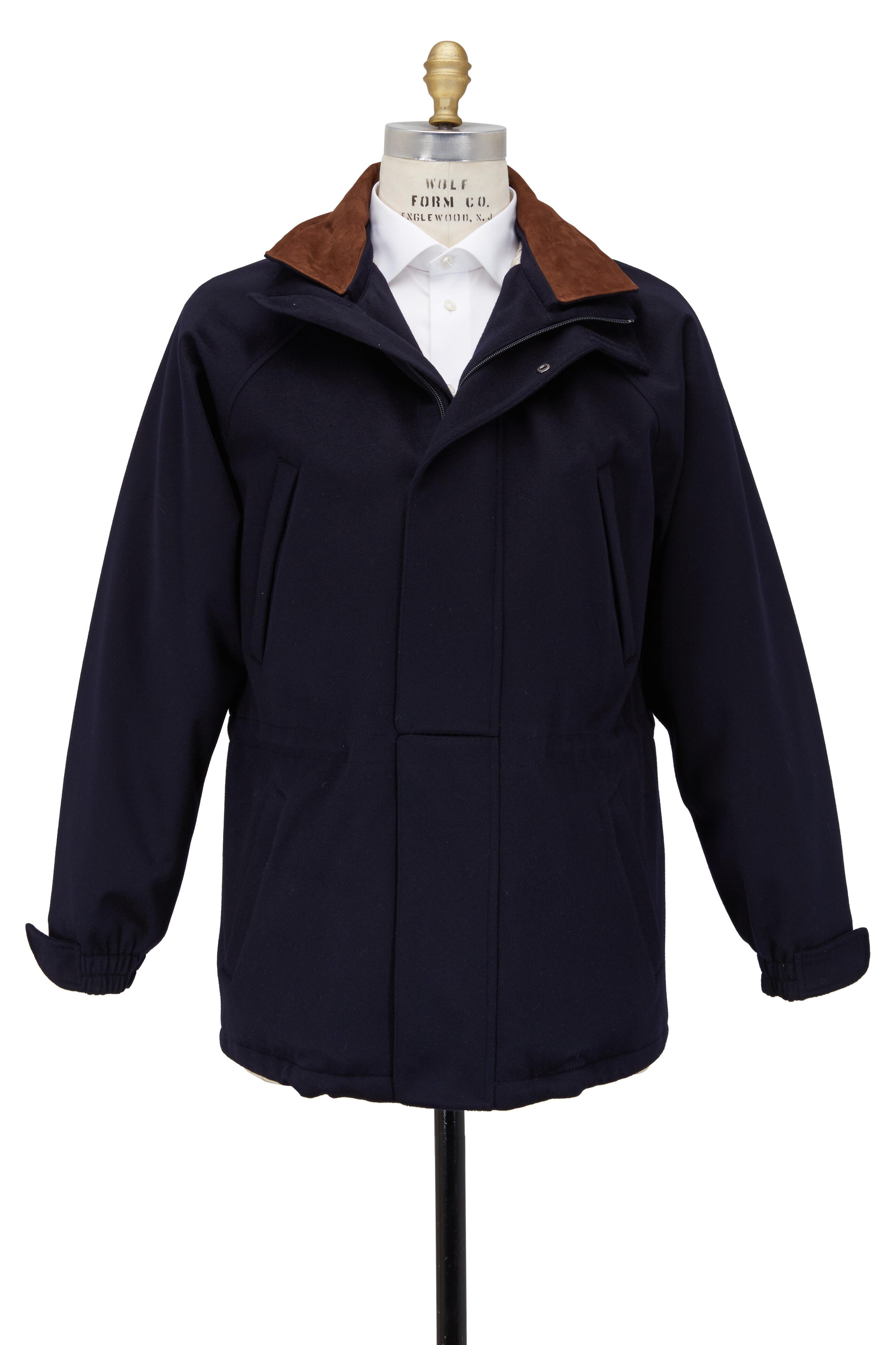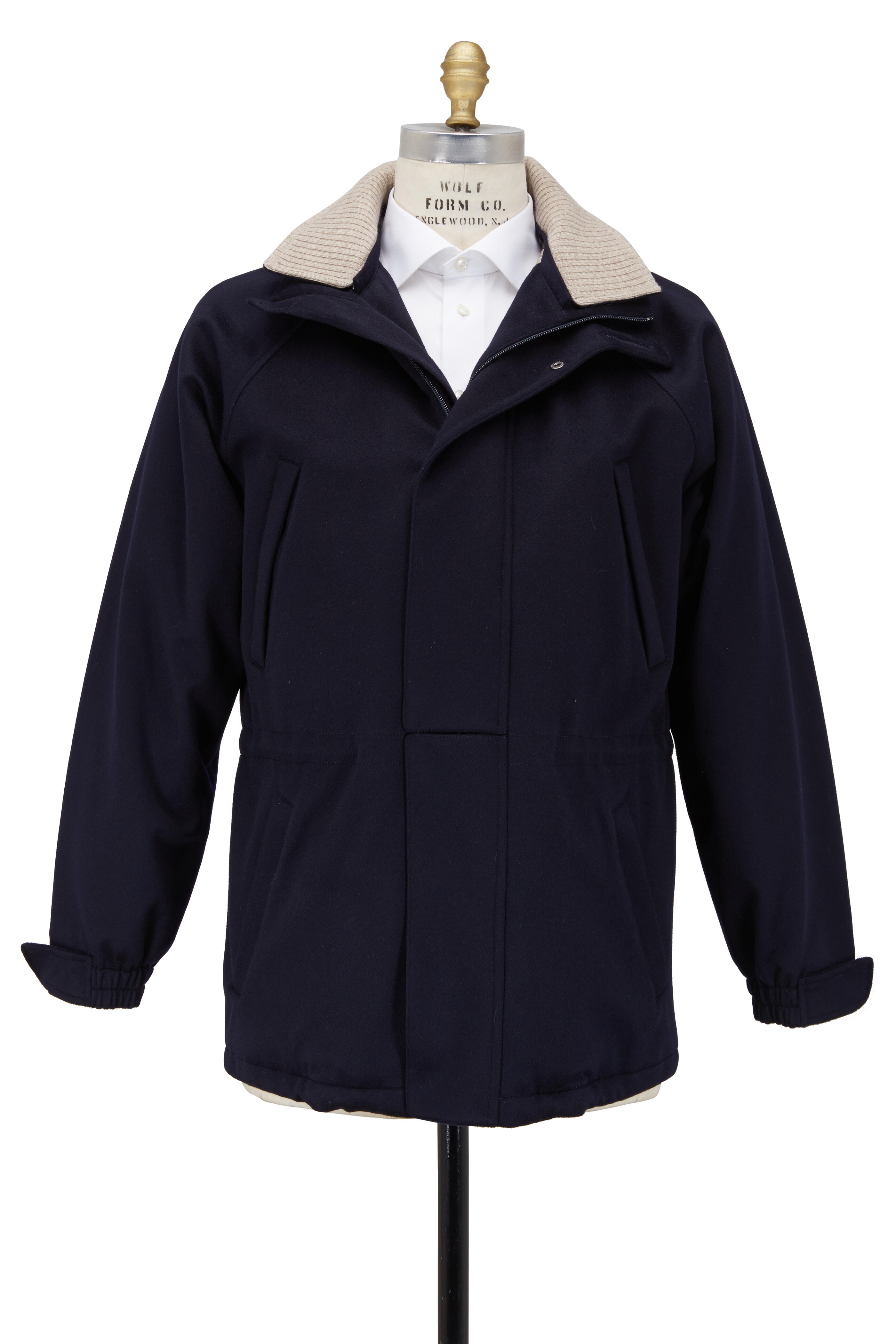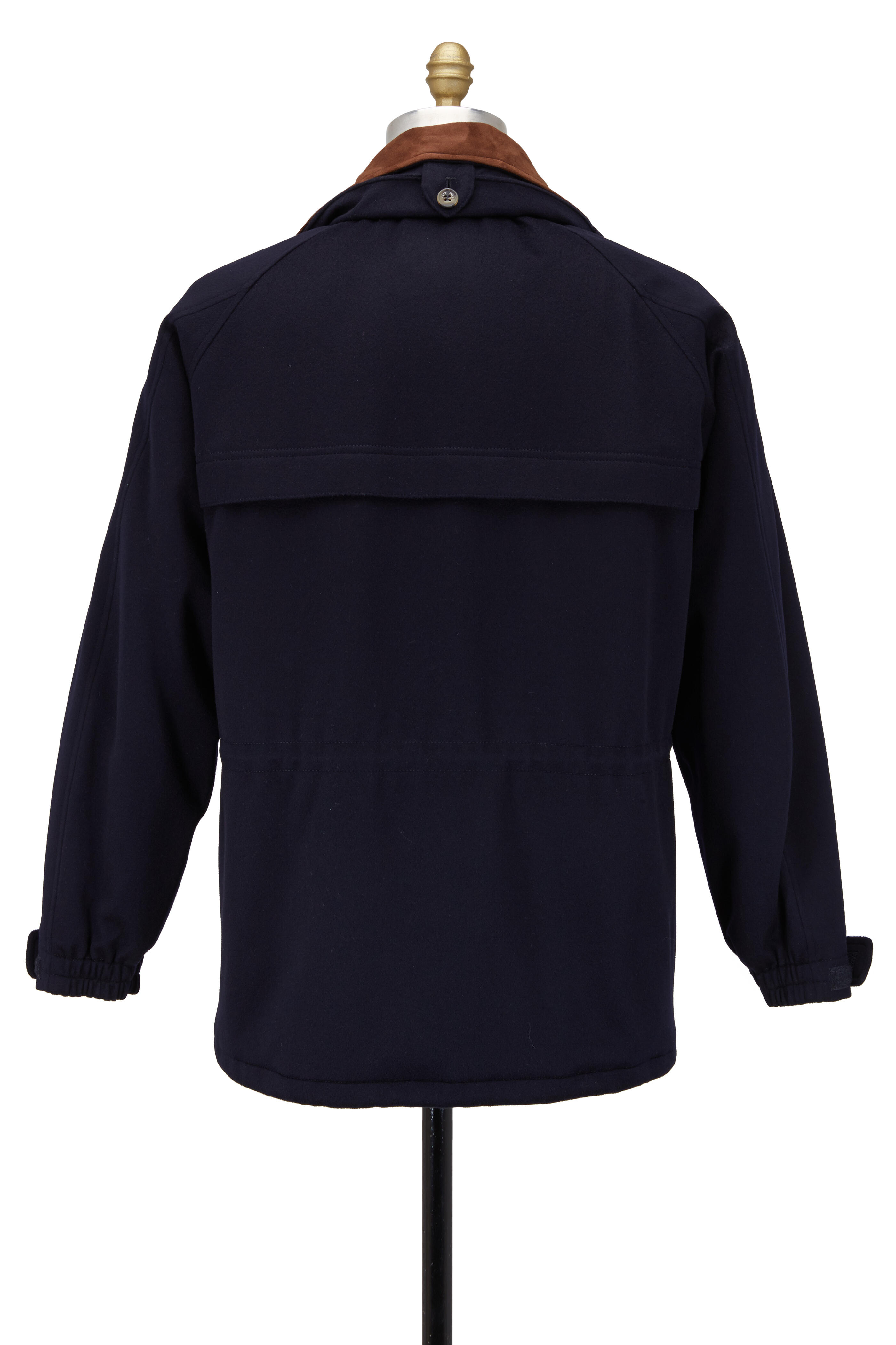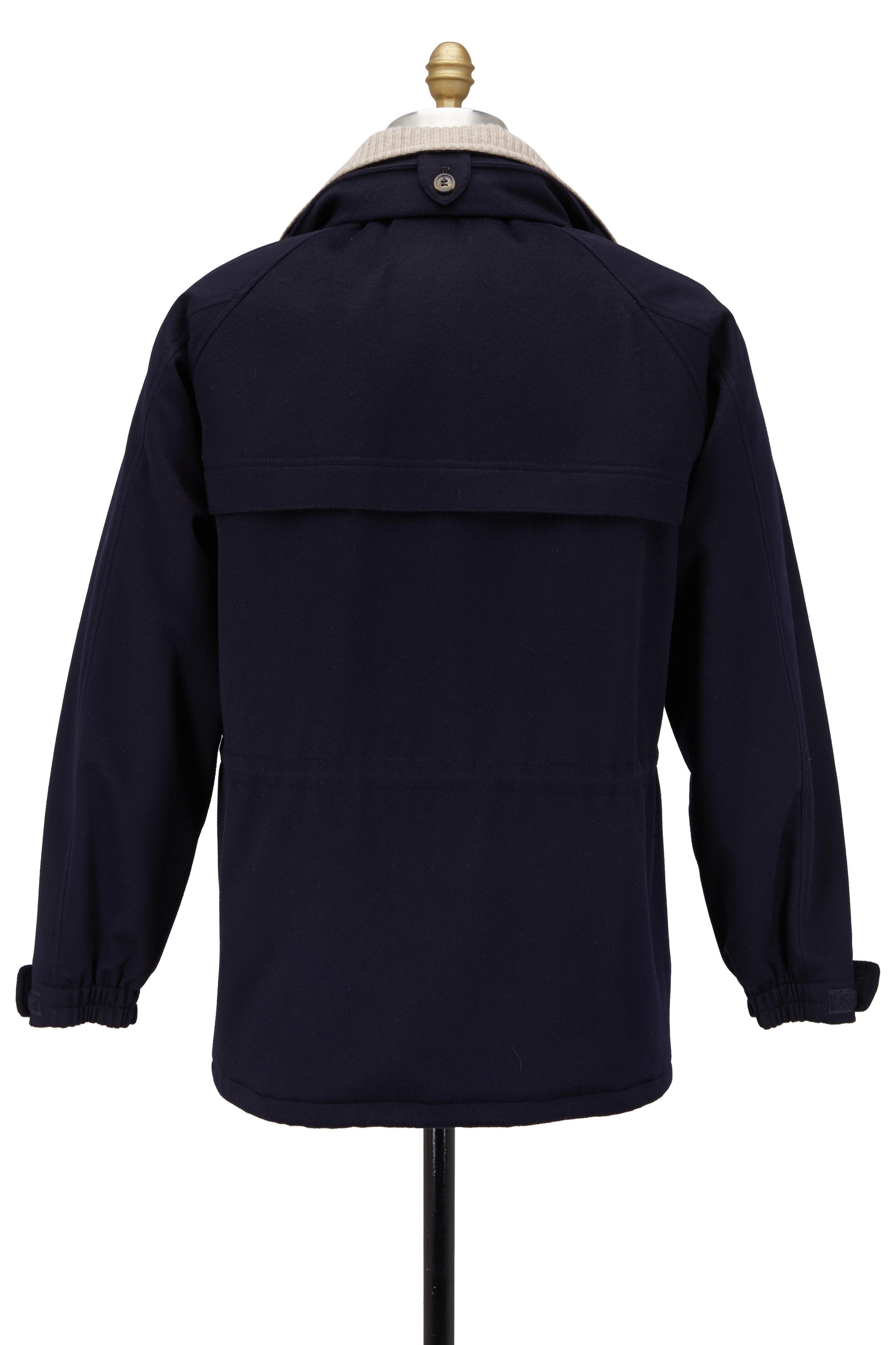 Double spread, detachable cashmere collar. Full zip closure, concealed snaps. Long sleeves, semi-elastic cuffs. Four diagonal welt pockets. Handmade in Italy. Body: 100% cashmere; lined. Dry clean.