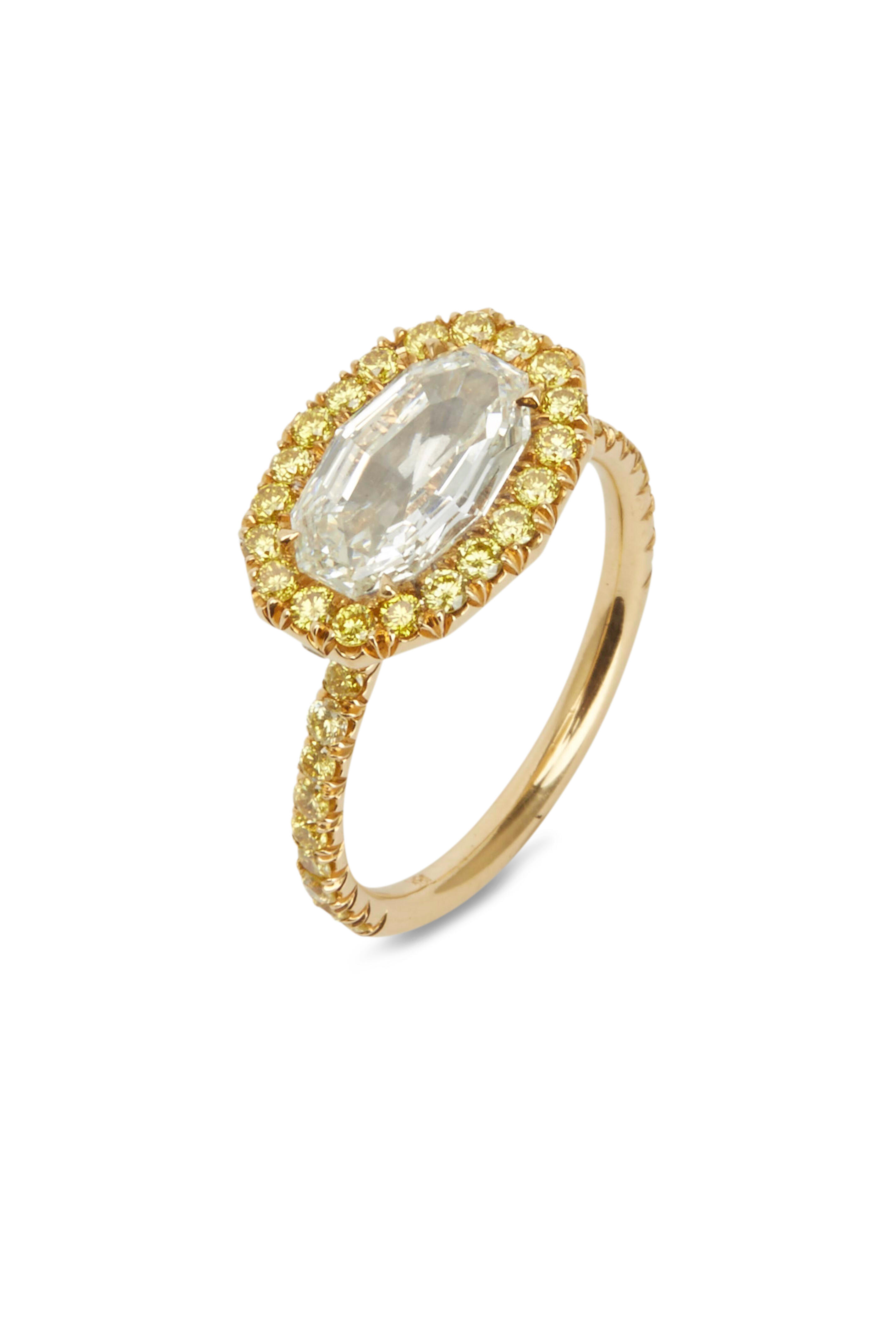 18k yellow gold. 1.76ct fancy-cut white diamond. .83cts fancy yellow diamonds.